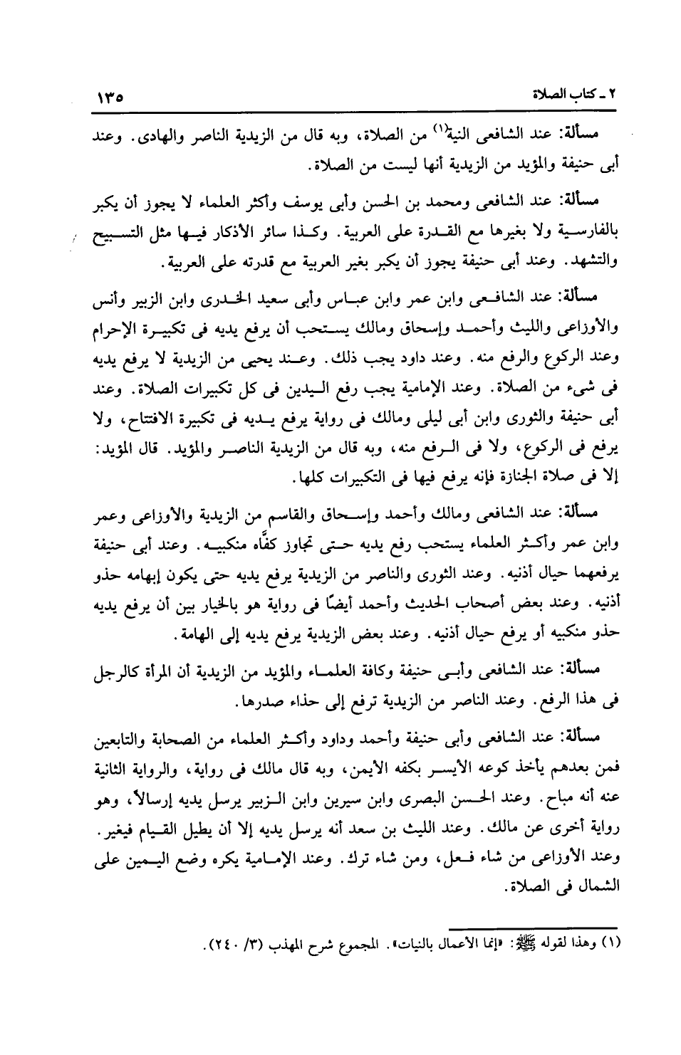 مَسْأَلَةٌ: عِنْدَ الشَّافِعِيِّ النية من الصلاة، وبه قال من الزَّيْدِيَّة النَّاصِر والهادي. وعند أَبِي حَنِيفَةَ والمؤيد من الزَّيْدِيَّة أنها ليست من الصلاة.