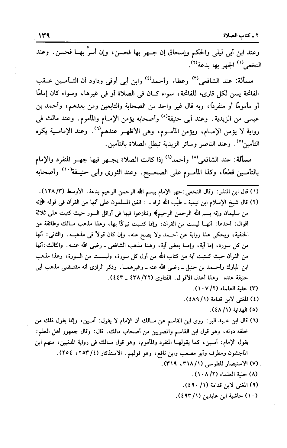 مَسْأَلَةٌ: عِنْدَ الشَّافِعِيِّ وعَطَاء وَأَحْمَد وابن أبي أوفى وداود أن التأمين عقب الفاتحة يسن لكل قارئ للفاتحة، سواء كان في الصلاة أو في غيرها، وسواء كان إمامًا أو مأمومًا أو منفردًا، وبه قال غير واحد من الصحابة والتابعين ومن بعدهم، وَأَحْمَد بن عيسى من الزَّيْدِيَّة. وعند أَبِي حَنِيفَةَ وأصحابه يؤمن الإمام والمأموم. وعند مالك في رِوَايَة لا يؤمن الإمام، ويؤمن المأموم، وهي الأظهر عندهم. وعند الْإِمَامِيَّة يكره التأمين. وعند النَّاصِر وسائر الزَّيْدِيَّة تبطل الصلاة بالتأمين.