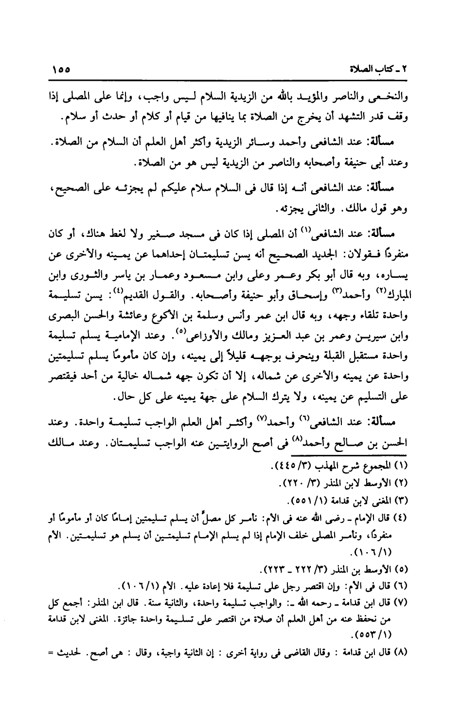 مَسْأَلَةٌ: عِنْدَ الشَّافِعِيِّ أن المصلي إذا كان في مسجد صغير ولا لغط هناك، أو كان منفردًا فقَوْلَانِ: الجديد الصحيح أنه يسن تسليمتان إحداهما عن يمينه والأخرى عن يساره، وبه قال أبو بكر وعمر وعلي وابن مسعود وعمار بن ياسر والثَّوْرِيّ وابن الْمُبَارَك وَأَحْمَد وإِسْحَاق وأبو حَنِيفَةَ وأصحابه. والقول القديم: يسن تسليمة واحدة تلقاء وجهه، وبه قال ابن عمر وأنس وسلمة بن الأكوع وعائشة والحسن البصري وابن سِيرِينَ وعمر بن عبد العزيز وَمَالِك والْأَوْزَاعِيّ. وعند الْإِمَامِيَّة يسلم تسليمة واحدة مستقبل القبلة وينحرف بوجهه قليلًا إلى يمينه، وإن كان مأمومًا يسلم تسليمتين واحدة عن يمينه والأخرى عن شماله، إلا أن تكون جهه شماله خالية من أحد فيقتصر على التسليم عن يمينه، ولا يترك السلام على جهة يمينه على كل حال.