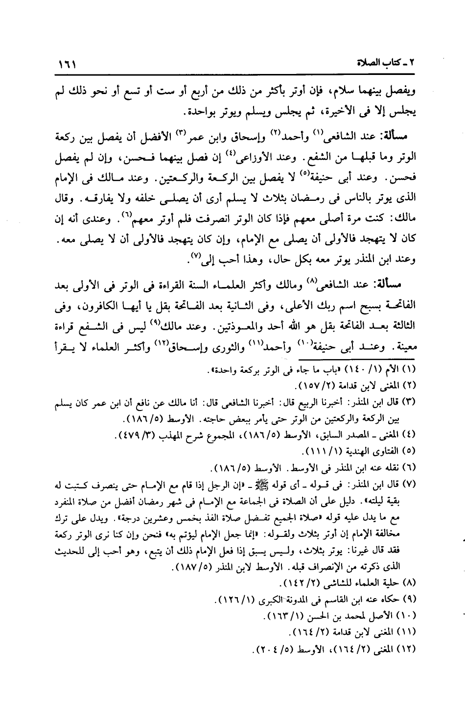 مَسْأَلَةٌ: عِنْدَ الشَّافِعِيِّ وَأَحْمَدَ وإِسْحَاق وابن عمر الأفضل أن يفصل بين ركعة الوتر وما قبلها من الشفع. وعند الْأَوْزَاعِيّ إن فصل بينهما فحسن، وإن لم يفصل فحسن. وعند أَبِي حَنِيفَةَ لا يفصل بين الركعة والركعتين. وعند مالك في الإمام الذي يوتر بالناس في رمضان بثلاث لا يسلم أرى أن يصلي خلفه ولا يفارقه. وقال مالك: كنت مرة أصلى معهم فإذا كان الوتر انصرفت فلم أوتر معهم. وعندي أنه إن كان لا يتهجد فالأولى أن يصلي مع الإمام، وإن كان يتهجد فالأولى أن لا يصلي معه. وعند ابن المنذر يوتر معه بكل حال، وهذا أحب إلى.