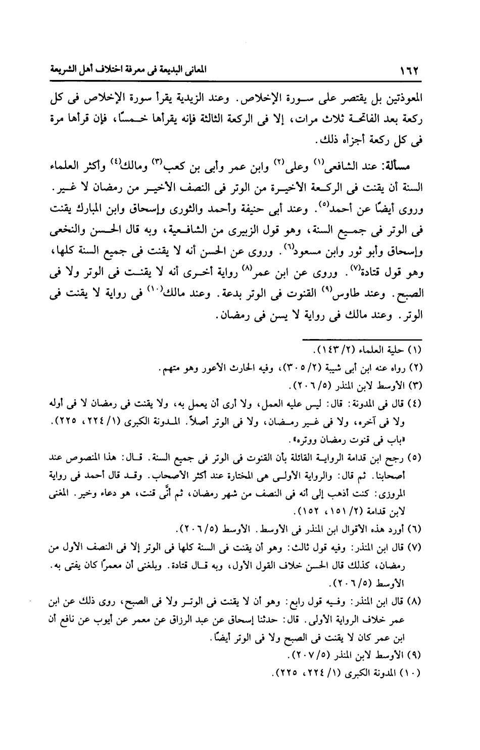 مَسْأَلَةٌ: عِنْدَ الشَّافِعِيِّ وعلي وابن عمر وأبي بن كعب وَمَالِك وأَكْثَر الْعُلَمَاءِ السنة أن يقنت في الركعة الأخيرة من الوتر في النصف الأخير من رمضان لا غير. وروى أيضًا عن أحمد. وعند أَبِي حَنِيفَةَ وَأَحْمَد والثَّوْرِيّ وإِسْحَاق وابن الْمُبَارَك يقنت فى الوتر في جميع السنة، وهو قول الزبيري من الشَّافِعِيَّة، وبه قال الحسن والنَّخَعِيّ وإِسْحَاق وأبو ثور وابن مسعود. وروى عن الحسن أنه لا يقنت في جميع السنة كلها، وهو قول قتادة. وروى عن ابن عمر رِوَايَة أخرى أنه لا يقنت في الوتر ولا في الصبح. وعند طاوس القنوت في الوتر بدعة. وعند مالك في رِوَايَة لا يقنت في الوتر. وعند مالك في رِوَايَة لا يسن في رمضان.