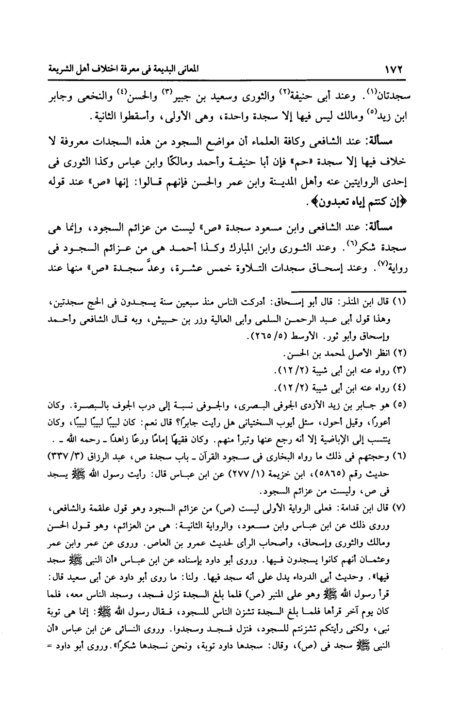 مَسْأَلَةٌ: عِنْدَ الشَّافِعِيِّ وابن مسعود سجدة (ص) ليست من عزائم السجود، وإنَّما هي سجدة شكر. وعند الثَّوْرِيّ وابن الْمُبَارَك وكذا أَحْمَد هي من عزائم السجود في رِوَايَة. وعند إِسْحَاق سجدات التلاوة خمس عشرة، وعدَّ سجدة (ص) منها عند