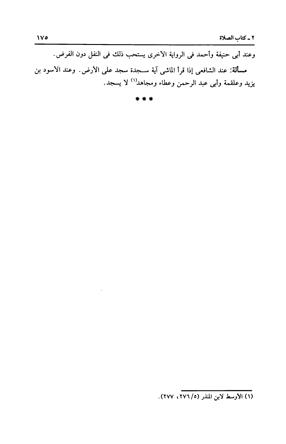 مَسْأَلَةٌ: عِنْدَ الشَّافِعِيِّ إذا قرأ الماشي آية سجدة سجد على الأرض. وعند الأسود بن يزيد وعلقمة وأبي عبد الرحمن وعَطَاء ومجاهد لا يسجد.