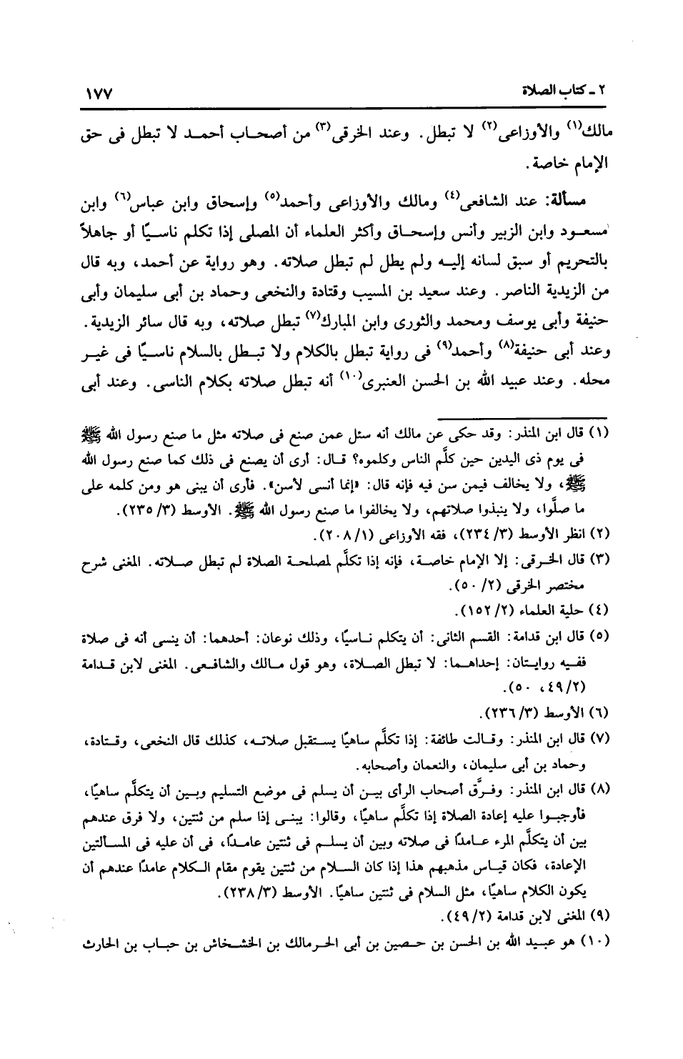 مَسْأَلَةٌ: عِنْدَ الشَّافِعِيِّ وَمَالِك والْأَوْزَاعِيّ وَأَحْمَد وإِسْحَاق وابن عباس وابن مسعود وابن الزبير وأنس وإِسْحَاق وأَكْثَر الْعُلَمَاءِ أن المصلي إذا تكلم ناسيًا أو جاهلاً بالتحريم أو سبق لسانه إليه ولم يطل لم تبطل صلاته. وهو رِوَايَة عن أحمد، وبه قال من الزَّيْدِيَّة النَّاصِر. وعند سعيد بن المسيب وقتادة والنَّخَعِيّ وحماد بن أبي سليمان وأبي حَنِيفَةَ وأَبِي يُوسُفَ ومُحَمَّد والثَّوْرِيّ وابن الْمُبَارَك تبطل صلاته، وبه قال سائر الزَّيْدِيَّة. وعند أَبِي حَنِيفَةَ وَأَحْمَد في رِوَايَة تبطل بالكلام ولا تبطل بالسلام ناسيًا في غير محله. وعند عبيد الله بن الحسن العنبري أنه تبطل صلاته بكلام الناسي. وعند أبي