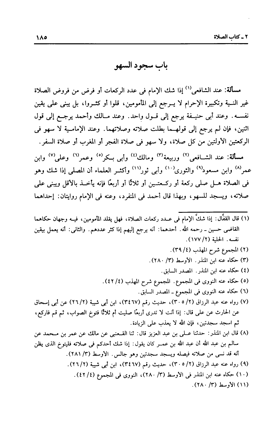 مَسْأَلَةٌ: عِنْدَ الشَّافِعِيِّ إذا شك الإمام في عدد الركعات أو فرض من فروض الصلاة غير النية وتكبيرة الإحرام لا يرجع إلى المأمومين، قلوا أو كثروا، بل يبني على يقين نفسه. وعند أَبِي حَنِيفَةَ يرجع إلى قول واحد. وعند مالك وَأَحْمَد يرجع إلى قول اثنين، فإن لم يرجع إلى قولهما بطلت صلاته وصلاتهما. وعند الْإِمَامِيَّة لا سهو في الركعتين الأولتين من كل صلاة، ولا سهو في صلاة الفجر أو المغرب أو صلاة السفر.