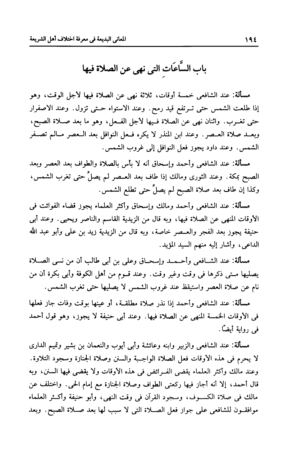 مَسْأَلَةٌ: عِنْدَ الشَّافِعِيِّ والزبير وابنه وعائشة وأبي أيوب والنعمان بن بشير وتميم الداري لا يحرم في هذه الأوقات فعل الصلاة الواجبة والسق وصلاة الجنازة وسجود التلاوة. وعند مالك وأَكْثَر الْعُلَمَاءِ يقضي الفرائض في هذه الأوقات ولا يقضي فيها السنن، وبه قال أحمد، إلا أنه أجاز فيها ركعتي الطواف وصلاة الجنازة مع إمام الحي. واختلف عن مالك في صلاة الكسوف، وسجود القرآن في وقت النهي، وأبو حَنِيفَةَ وأَكْثَر الْعُلَمَاءِ موافقون للشافعي على جواز فعل الصلاة التي لا سبب لها بعد صلاة الصبح. وبعد