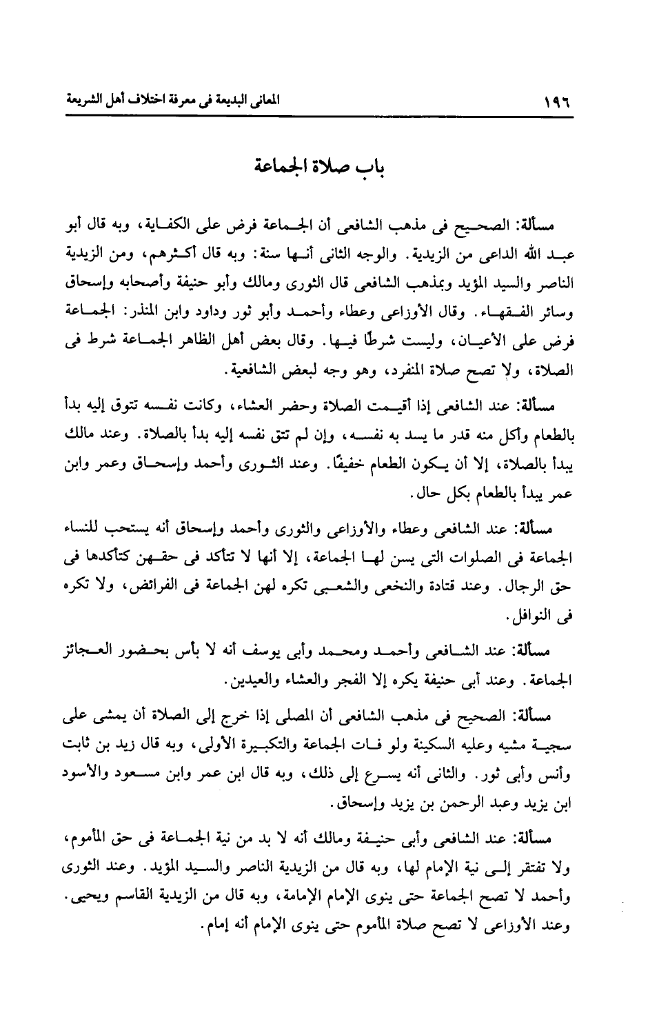 مسألة: الصحيح في مذهب الشَّافِعِيّ أن الجماعة فرض على الكفاية، وبه قال أبو عبد اللَّه الداعي من الزَّيْدِيَّة. والوجه الثاني أنها سنة: وبه قال أكثرهم، ومن الزَّيْدِيَّة النَّاصِر والسيد المؤيد وبمذهب الشَّافِعِيّ قال الثَّوْرِيّ وَمَالِك وأبو حَنِيفَةَ وأصحابه وإِسْحَاق وسائر الفقهاء. وقال الْأَوْزَاعِيّ وعَطَاء وَأَحْمَد وأبو ثور وداود وابن المنذر: الجماعة فرض على الأعيان، وليست شرطًا فيها. وقال بعض أهل الظاهر الجماعة شرط في الصلاة، ولا تصح صلاة المنفرد، وهو وجه لبعض الشَّافِعِيَّة.