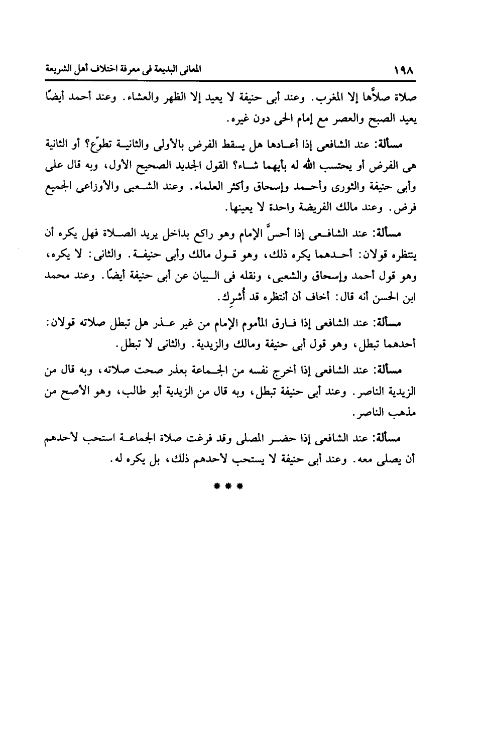مَسْأَلَةٌ: عِنْدَ الشَّافِعِيِّ إذا أعادها هل يسقط الفرض بالأولى والثانية تطوّع؟ أو الثانية هي الفرض أو يحتسب الله له بأيهما شاء؟ القول الجديد الصحيح الأول، وبه قال علي وأَبِي حَنِيفَةَ والثَّوْرِيّ وَأَحْمَد وإِسْحَاق وأَكْثَر الْعُلَمَاءِ. وعند الشعبي والْأَوْزَاعِيّ الجميع فرض. وعند مالك الفريضة واحدة لا يعينها.