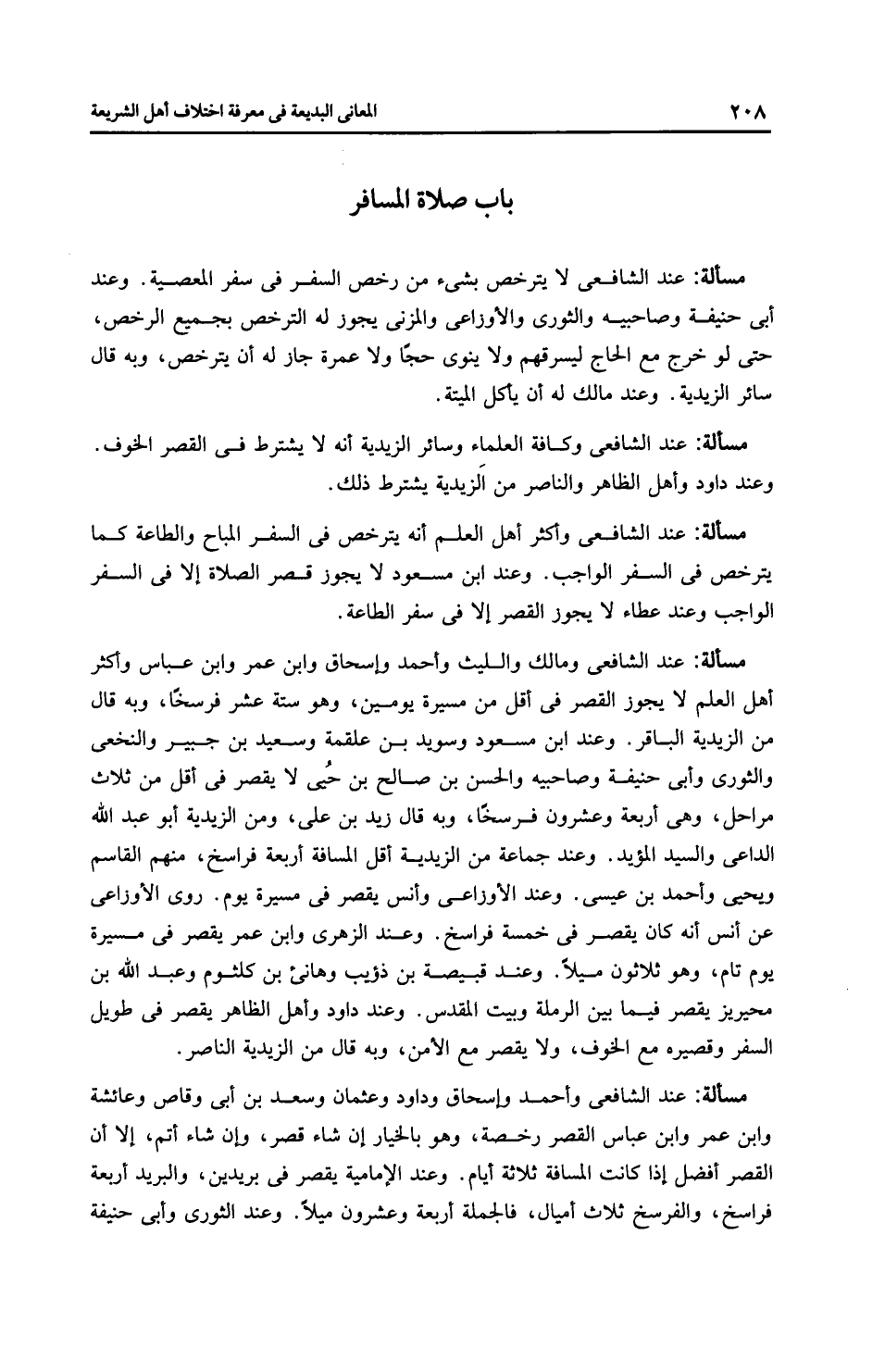 مَسْأَلَةٌ: عِنْدَ الشَّافِعِيِّ وَمَالِك واللَّيْث وَأَحْمَد وإِسْحَاق وابن عمر وابن عَبَّاسٍ وأكثر أهل العلم لا يجوز القصر في أقل من مسيرة يومين، وهو ستة عشر فرسخًا، وبه قال من الزَّيْدِيَّة الباقر. وعند ابن مسعود وسويد بن علقمة وسعيد بن جبير والنَّخَعِيّ والثَّوْرِيّ وأَبِي حَنِيفَةَ وصاحبيه والحسن بن صالح بن حُيي لا يقصر في أقل من ثلاث مراحل، وهي أربعة وعشرون فرسخًا، وبه قال زيد بن علي، ومن الزَّيْدِيَّة أبو عبد الله الداعي والسيد المؤيد. وعند جماعة من الزَّيْدِيَّة أقل المسافة أربعة فراسخ، منهم القاسم ويَحْيَى وَأَحْمَد بن عيسى. وعند الْأَوْزَاعِيّ وأنس يقصر في مسيرة يوم. روى الْأَوْزَاعِيّ عن أنس أنه كان يقصر في خمسة فراسخ. وعند الزُّهْرِيّ وابن عمر يقصر في مسيرة يوم تام، وهو ثلاثون ميلاً. وعند قبيصة بن ذؤيب وهانئ بن كلثوم وعبد الله بن محيريز يقصر فيما بين الرملة وبيت المقدس. وعند داود وأهل الظاهر يقصر في طويل السفر وقصيره مع الخوف، ولا يقصر مع الأمن، وبه قال من الزَّيْدِيَّة النَّاصِر.