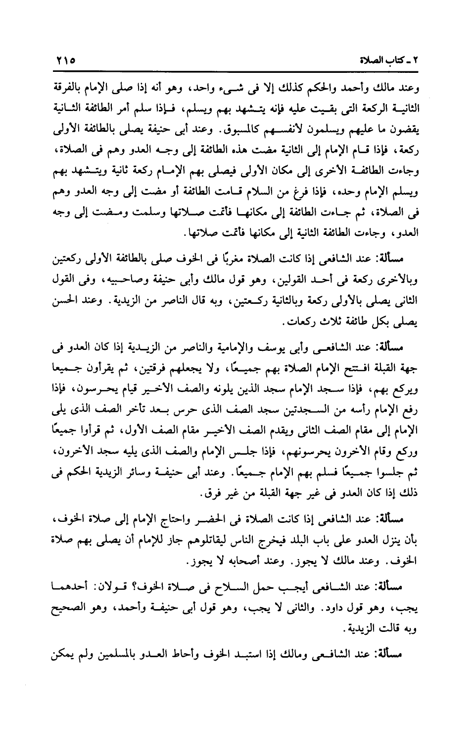 وعند مالك وَأَحْمَد والحكم كذلك إلا في شيء واحد، وهو أنه إذا صلى الإمام بالفرقة الثانية الركعة التي بقيت عليه فإنه يتشهد بهم ويسلم، فإذا سلم أمر الطائفة الثانية يقضون ما عليهم ويسلمون لأنفسهم كالمسبوق. وعند أَبِي حَنِيفَةَ يصلي بالطائفة الأولى ركعة، فإذا قام الإمام إلى الثانية مضت هذه الطائفة إلى وجه العدو وهم في الصلاة، وجاءت الطائفة الأخرى إلى مكان الأولى فيصلي بهم الإمام ركعة ثانية ويتشهد بهم ويسلم الإمام وحده، فإذا فرغ من السلام قامت الطائفة أو مضت إلى وجه العدو وهم فى الصلاة، ثم جاءت الطائفة إلى مكانها فأتمت صلاتها وسلمت ومضت إلى وجه العدو، وجاءت الطائفة الثانية إلى مكانها فأتمت صلاتها.