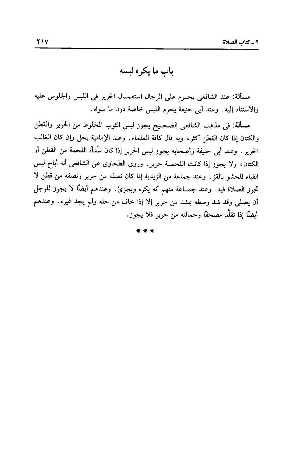 مَسْأَلَةٌ: فِي مَذْهَبِ الشَّافِعِيِّ الصحيح يجوز لبس الثوب المخلوط من الحرير والقطن والكتان إذا كان القطن أكثر، وبه قال كافة العلماء. وعند الْإِمَامِيَّة يحل وإن كان الغالب الحرير. وعند أَبِي حَنِيفَةَ وأصحابه يجوز لبس الحرير إذا كان سَدأة اللحمة من القطن أو الكتان، ولا يجوز إذا كانت اللحمة حرير. وروى الطحاوي عن الشَّافِعِيّ أنه أباح لبس القباء المحشو بالقز. وعند جماعة من الزَّيْدِيَّة إذا كان نصفه من حرير ونصفه من قطن لا تجوز الصلاة فيه. وعند جماعة منهم أنه يكره ويجزئ. وعندهم أيضًا لا يجوز للرجل أن يصلي وقد شد وسطه بمشد من حرير إلا إذا خاف من حله ولم يجد غيره. وعندهم أيضًا إذا تقلَّد مصحفًا وحمالته من حرير فلا يجوز.