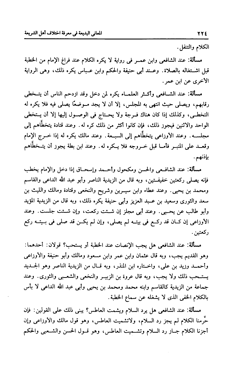 مَسْأَلَةٌ: عِنْدَ الشَّافِعِيِّ وابن عمر في رِوَايَة لا يكره الكلام عند فراغ الإمام من الخطبة قبل اشتغاله بالصلاة. وعند أَبِي حَنِيفَةَ والحكم وابن عَبَّاسٍ يكره ذلك، وهي الرِوَايَة الأخرى عن ابن عمر.