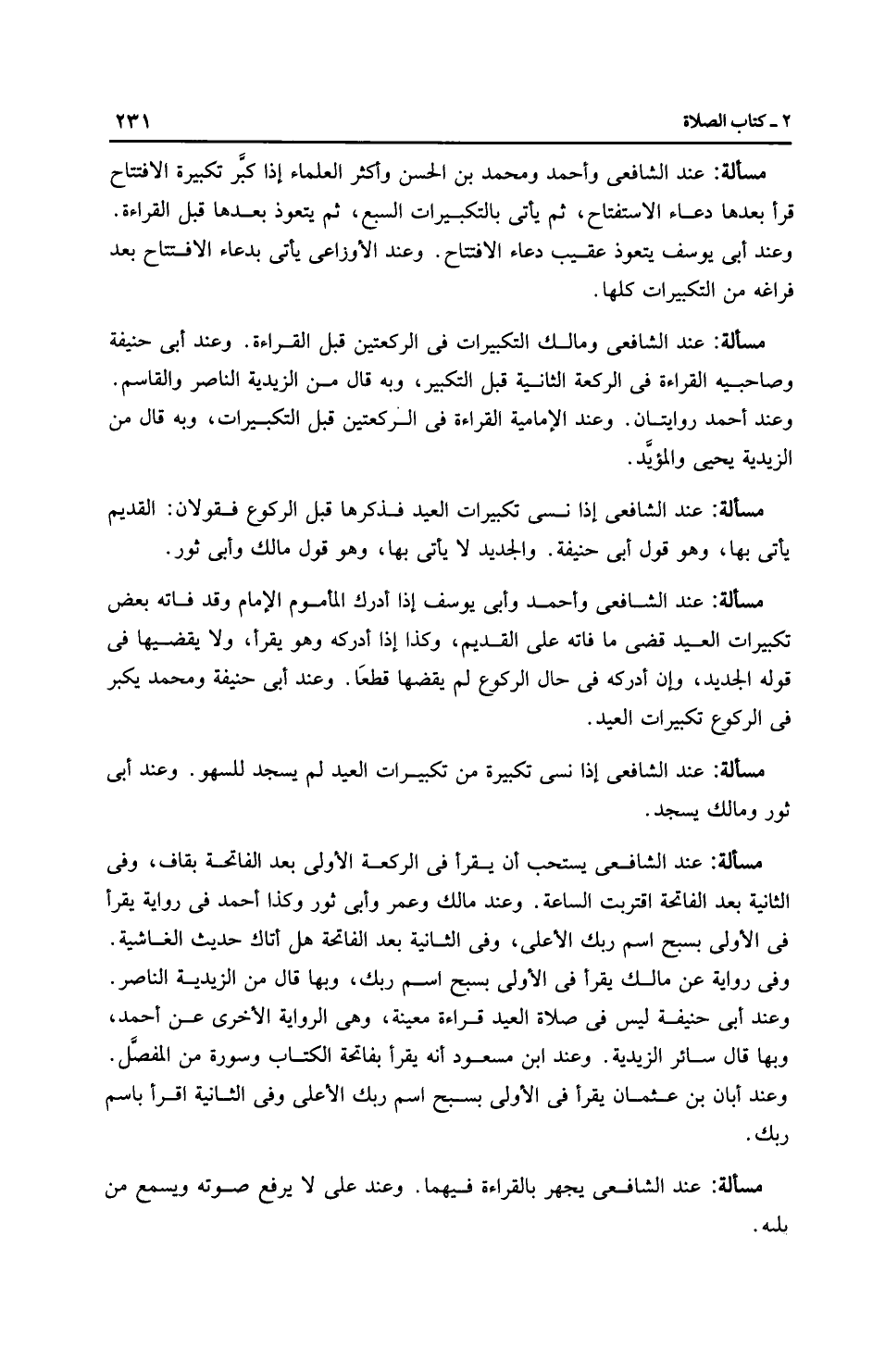 مَسْأَلَةٌ: عِنْدَ الشَّافِعِيِّ وَمَالِك التكبيرات في الركعتين قبل القراءة. وعند أَبِي حَنِيفَةَ وصاحبيه القراءة في الركعة الثانية قبل التكبير، وبه قال من الزَّيْدِيَّة النَّاصِر والقاسم. وعند أَحْمَد رِوَايَتَانِ. وعند الْإِمَامِيَّة القراءة في الركعتين قبل التكبيرات، وبه قال من الزَّيْدِيَّة يَحْيَى والمؤيَّد.
