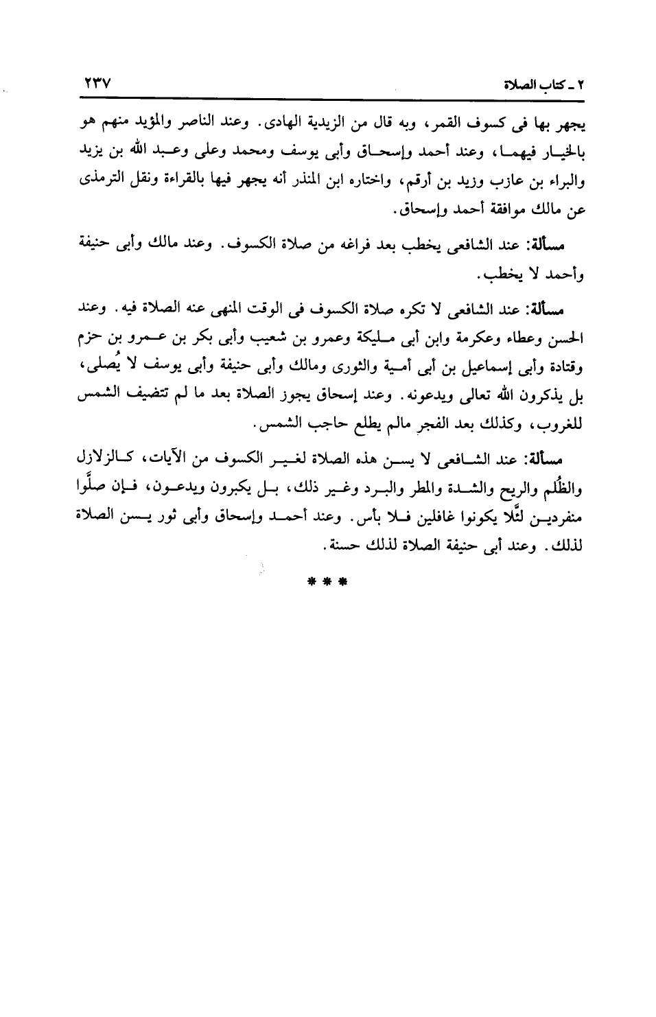 مَسْأَلَةٌ: عِنْدَ الشَّافِعِيِّ لا تكره صلاة الكسوف في الوقت المنهي عنه الصلاة فيه. وعند الحسن وعَطَاء وعكرمة وابن أبي مليكة وعمرو بن شعيب وأبي بكر بن عمرو بن حزم وقتادة وأبي إسماعيل بن أبي أمية والثَّوْرِيّ وَمَالِك وأَبِي حَنِيفَةَ وأَبِي يُوسُفَ لا يُصلي، بل يذكرون الله تعالى ويدعونه. وعند إِسْحَاق يجوز الصلاة بعد ما لم تتضيف الشمس للغروب، وكذلك بعد الفجر ما لم يطلع حاجب الشمس.