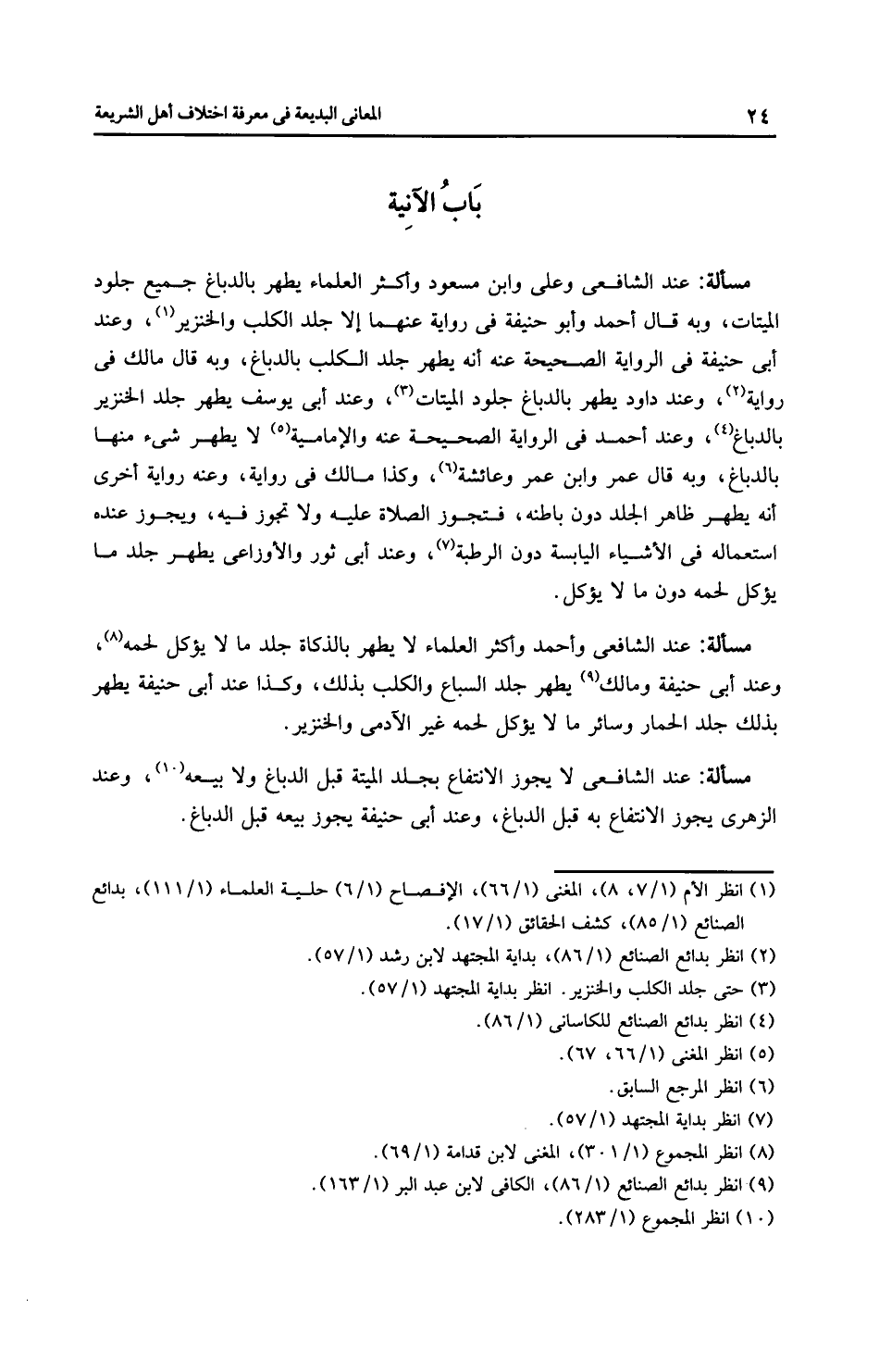 مَسْأَلَةٌ: عِنْدَ الشَّافِعِيِّ وعلي وابن مسعود وأَكْثَر الْعُلَمَاءِ يطهر بالدباغ جميع جلود الميتات، وبه قال أَحْمَد وأبو حَنِيفَةَ في رِوَايَة عنهما إلا جلد الكلب والخنزير، وعند أَبِي حَنِيفَةَ في الرِوَايَة الصحيحة عنه أنه يطهر جلد الكلب بالدباغ، وبه قال مالك في رِوَايَة، وعند داود يطهر بالدباغ جلود الميتات، وعند أَبِي يُوسُفَ يطهر جلد الخنزير بالدباغ، وعند أَحْمَد في الرِوَايَة الصحيحة عنه والْإِمَامِيَّة لا يطهر شيء منها بالدباغ، وبه قال عمر وابن عمر وعائشة، وكذا مالك في رِوَايَة، وعنه رِوَايَة أخرى أنه يطهر ظاهر الجلد دون باطنه، فتجوز الصلاة عليه ولا تجوز فيه، ويجوز عنده استعماله في الأشياء اليابسة دون الرطبة، وعند أَبِي ثَورٍ والْأَوْزَاعِيّ يطهر جلد ما يؤكل لحمه دون ما لا يؤكل.