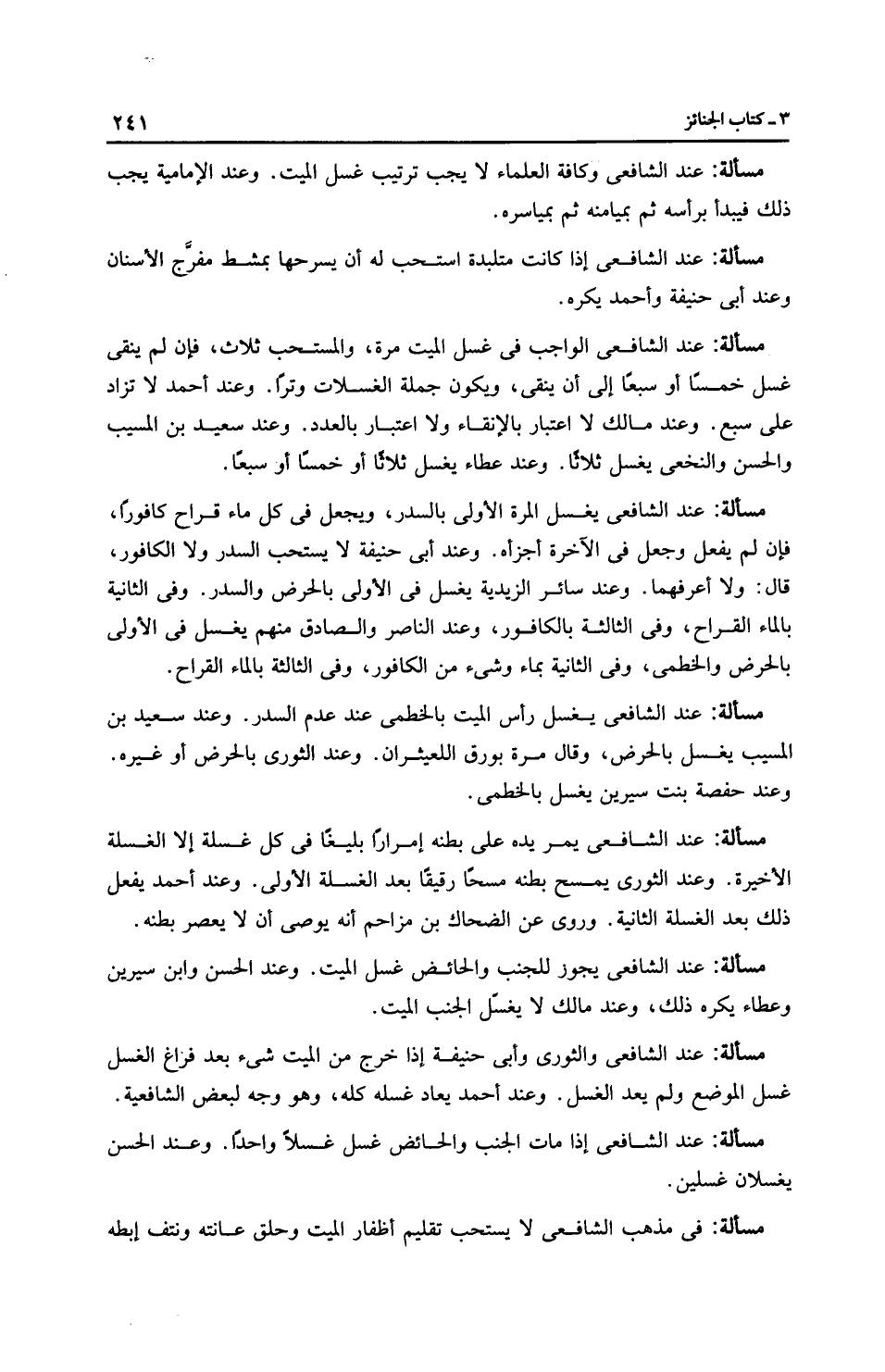 مَسْأَلَةٌ: عِنْدَ الشَّافِعِيِّ وكافة العلماء لا يجب ترتيب غسل الميت. وعند الْإِمَامِيَّة يجب ذلك فيبدأ برأسه ثم بميامنه ثم بمياسره.