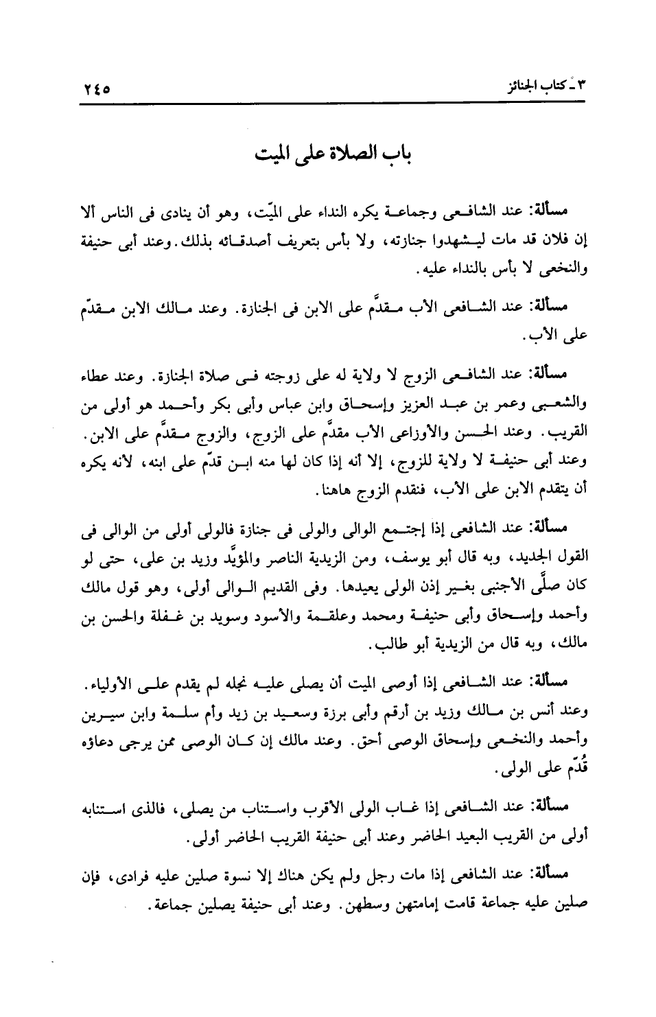 مَسْأَلَةٌ: عِنْدَ الشَّافِعِيِّ الزوج لا ولاية له على زوجته في صلاة الجنازة. وعند عَطَاء والشعبي وعمر بن عبد العزيز وإِسْحَاق وابن عَبَّاسٍ وأبي بكر وَأَحْمَد هو أولى من القريب. وعند الحسن والْأَوْزَاعِيّ الأب مقدَّم على الزوج، والزوج مقدَّم على الابن. وعند أَبِي حَنِيفَةَ لا ولاية للزوج، إلا أنه إذا كان لها منه ابن قدِّم على ابنه، لأنه يكره أن يتقدم الابن علي الأب، فنقدم الزوج هاهنا.