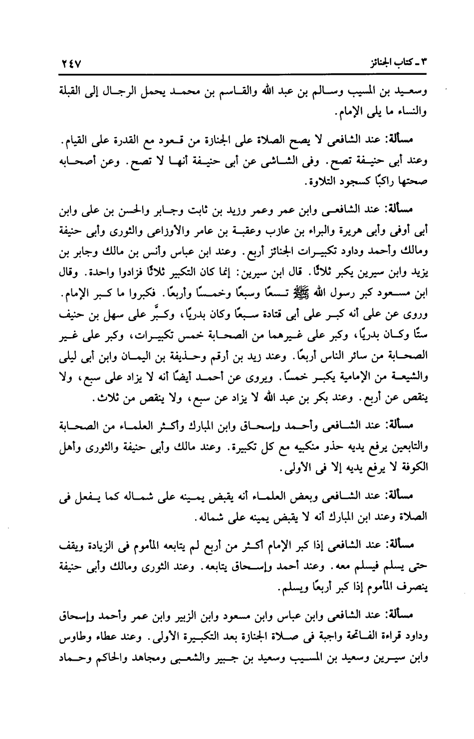 مَسْأَلَةٌ: عِنْدَ الشَّافِعِيِّ وابن عمر وعمر وزيد بن ثابت وجابر والحسن بن علي وابن أبي أوفى وأبي هريرة والبراء بن عازب وعقبة بن عامر والْأَوْزَاعِيّ والثَّوْرِيّ وأَبِي حَنِيفَةَ وَمَالِك وَأَحْمَد وداود تكبيرات الجنائز أربع. وعند ابن عَبَّاسٍ وأنس بن مالك وجابر بن يزيد وابن سِيرِينَ يكبر ثلاثًا. قال ابن سِيرِينَ: إنما كان التكبير ثلاثًا فزادوا واحدة. وقال ابن مسعود كبر رسول الله - صلى الله عليه وسلم - تسعًا وسبعًا وخمسًا وأربعًا. فكبروا ما كبر الإمام. وروى عن علي أنه كبر على أبي قتادة سبعًا وكان بدريًّا، وكبَّر على سهل بن حنيف ستًا وكان بدريًا، وكبر على غيرهما من الصحابة خمس تكبيرات، وكبر على غير الصحابة من سائر الناس أربعًا. وعند زيد بن أرقم وحذيفة بن اليمان وابن أبي ليلى والشيعة من الْإِمَامِيَّة يكبر خمسًا. ويروى عن أَحْمَد أيضًا أنه لا يزاد على سبع، ولا ينقص عن أربع. وعند بكر بن عبد الله لا يزاد عن سبع، ولا ينقص من ثلاث.