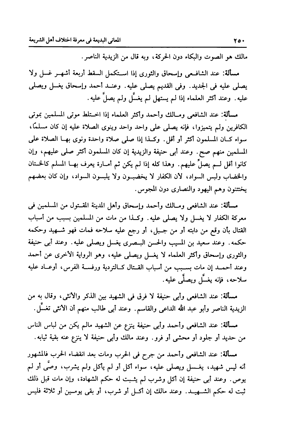 مَسْأَلَةٌ: عِنْدَ الشَّافِعِيِّ وَمَالِك وَأَحْمَد وأَكْثَر الْعُلَمَاءِ إذا اختلط موتى المسلمين بموتى الكافرين ولم يتميزوا، فإنه يصلي على واحد واحد وينوي الصلاة عليه إن كان مسلمًا، سواء كان المسلمون أكثر أو أقل. وكذا إذا صلى صلاة واحدة ونوى بها الصلاة على المسلمين منهم صح. وعند أَبِي حَنِيفَةَ والزَّيْدِيَّة إن كان المسلمون أكثر صلى عليهم، وإن كانوا أقل لم يصل عليهم. وهذا كله إذا لم يكن ثم أمارة يعرف بها المسلم كالختان والخضاب ولبس السواد، لأن الكفار لا يخضبون ولا يلبسون السواد، وإن كان بعضهم يختتنون وهم اليهود والنصارى دون المجوس.