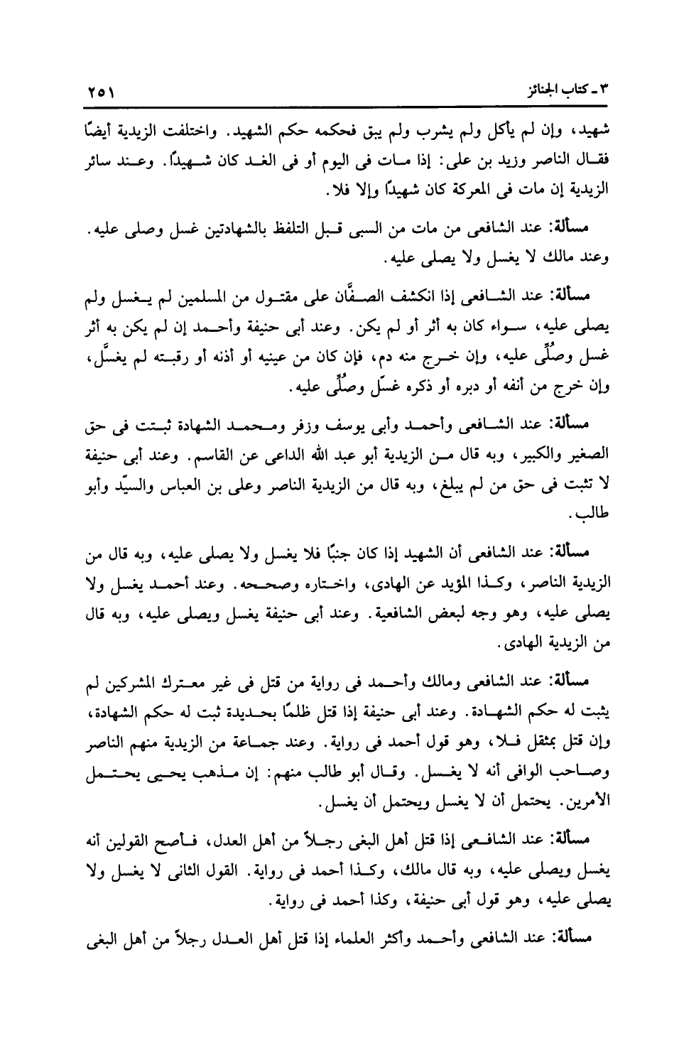 مَسْأَلَةٌ: عِنْدَ الشَّافِعِيِّ وَمَالِك وَأَحْمَد في رِوَايَة من قتل في غير معترك المشركين لم يثبت له حكم الشهادة. وعند أَبِي حَنِيفَةَ إذا قتل ظلمًا بحديدة ثبت له حكم الشهادة، وإن قتل بمثقل فلا، وهو قول أَحْمَد في رِوَايَة. وعند جماعة من الزَّيْدِيَّة منهم النَّاصِر وصاحب الوافي أنه لا يغسل. وقال أبو طالب منهم: إن مذهب يَحْيَى يحتمل الأمرين. يحتمل أن لا يغسل ويحتمل أن يغسل.