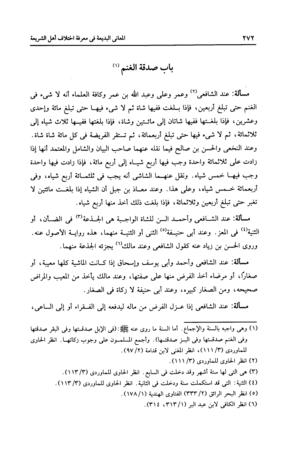 مسألة: عند الشافعه وَأَحْمَد السن للشاة الواجبة هي الجذعة في الضأن، أو الثنية في المعز. وعند أَبِي حَنِيفَةَ الثنى أو الثنية منهما، هذه رِوَايَة الأصول عنه. وروى الحسن بن زياد عنه كقول الشَّافِعِيّ وعند مالك يجزئه الجذعة منهما.
