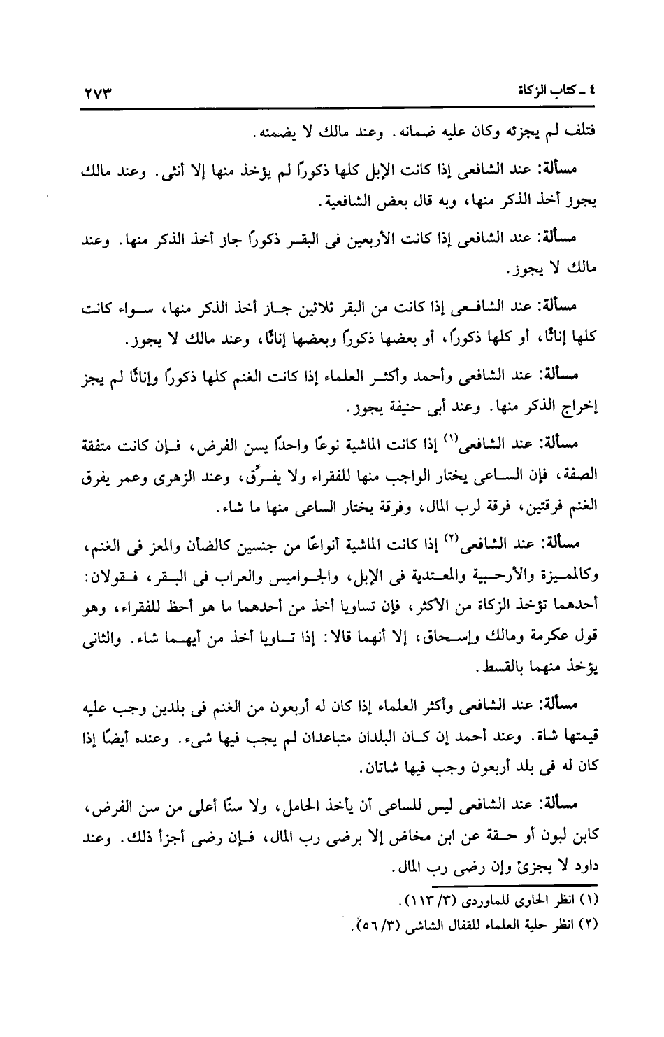 مَسْأَلَةٌ: عِنْدَ الشَّافِعِيِّ وأَكْثَر الْعُلَمَاءِ إذا كان له أربعون من الغنم في بلدين وجب عليه قيمتها شاة. وعند أَحْمَد إن كان البلدان متباعدان لم يجب فيها شيء. وعنده أيضًا إذا كان له في بلد أربعون وجب فيها شاتان.