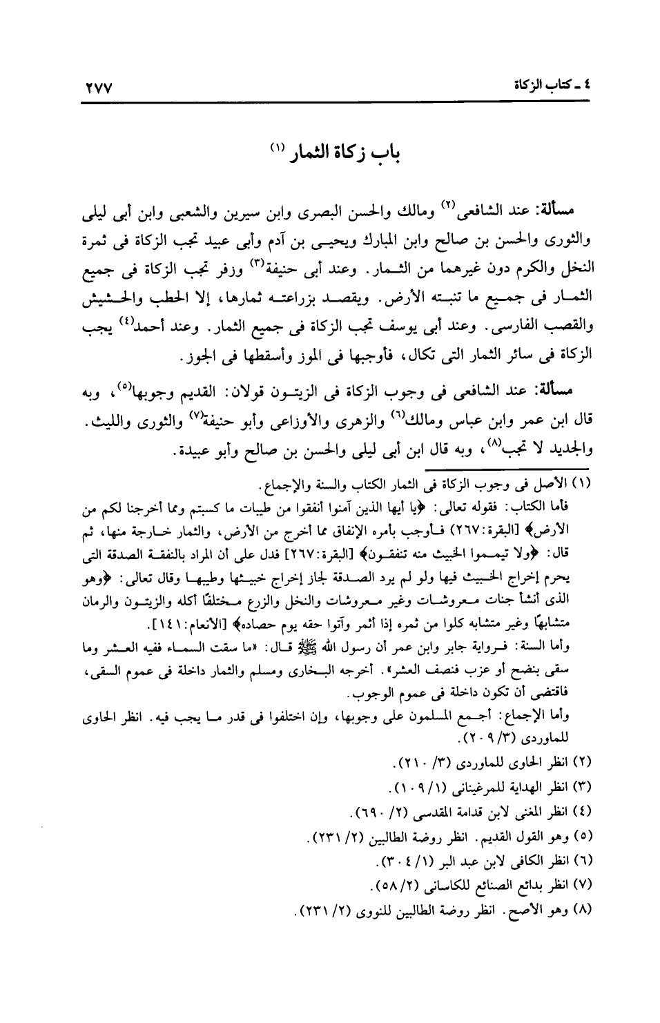 مَسْأَلَةٌ: عِنْدَ الشَّافِعِيِّ في وجوب الزكاة في الزيتون قَوْلَانِ: القديم وجوبها، وبه قال ابن عمر وابن عَبَّاسٍ وَمَالِك والزُّهْرِيّ والْأَوْزَاعِيّ وأبو حَنِيفَةَ والثَّوْرِيّ واللَّيْث. والجديد لا تجب، وبه قال ابن أبي ليلى والحسن بن صالح وأبو عبيدة.
