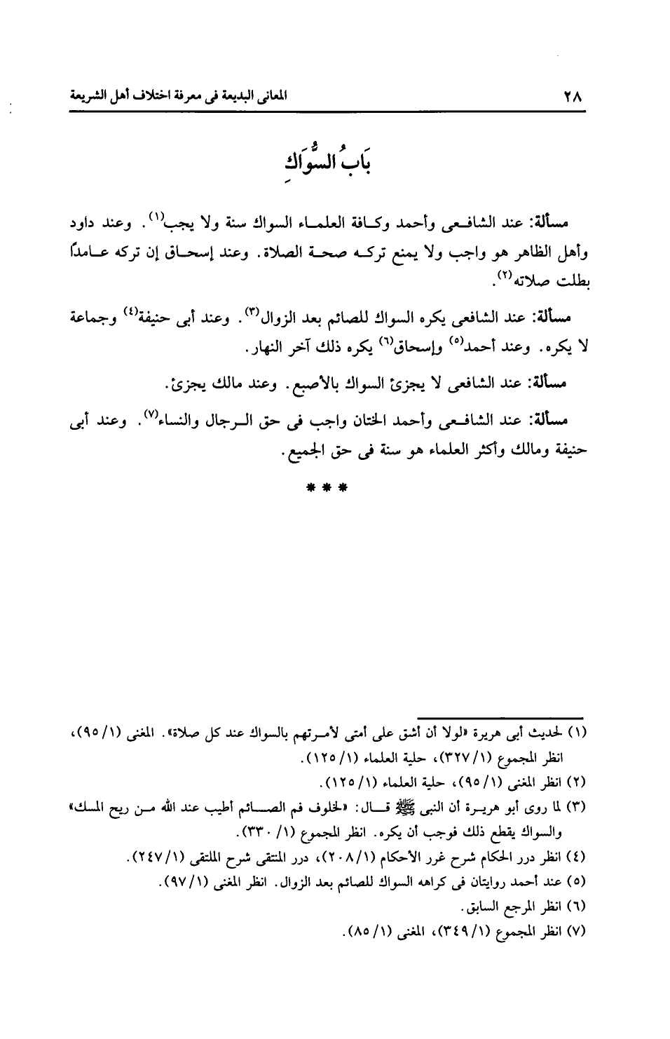 مَسْأَلَةٌ: عِنْدَ الشَّافِعِيِّ وَأَحْمَدَ وكافة العلماء السواك سنة ولا يجب. وعند داود وأهل الظاهر هو واجب ولا يمنع تركه صحة الصلاة. وعند إِسْحَاق إن تركه عامدًا بطلت صلاته.