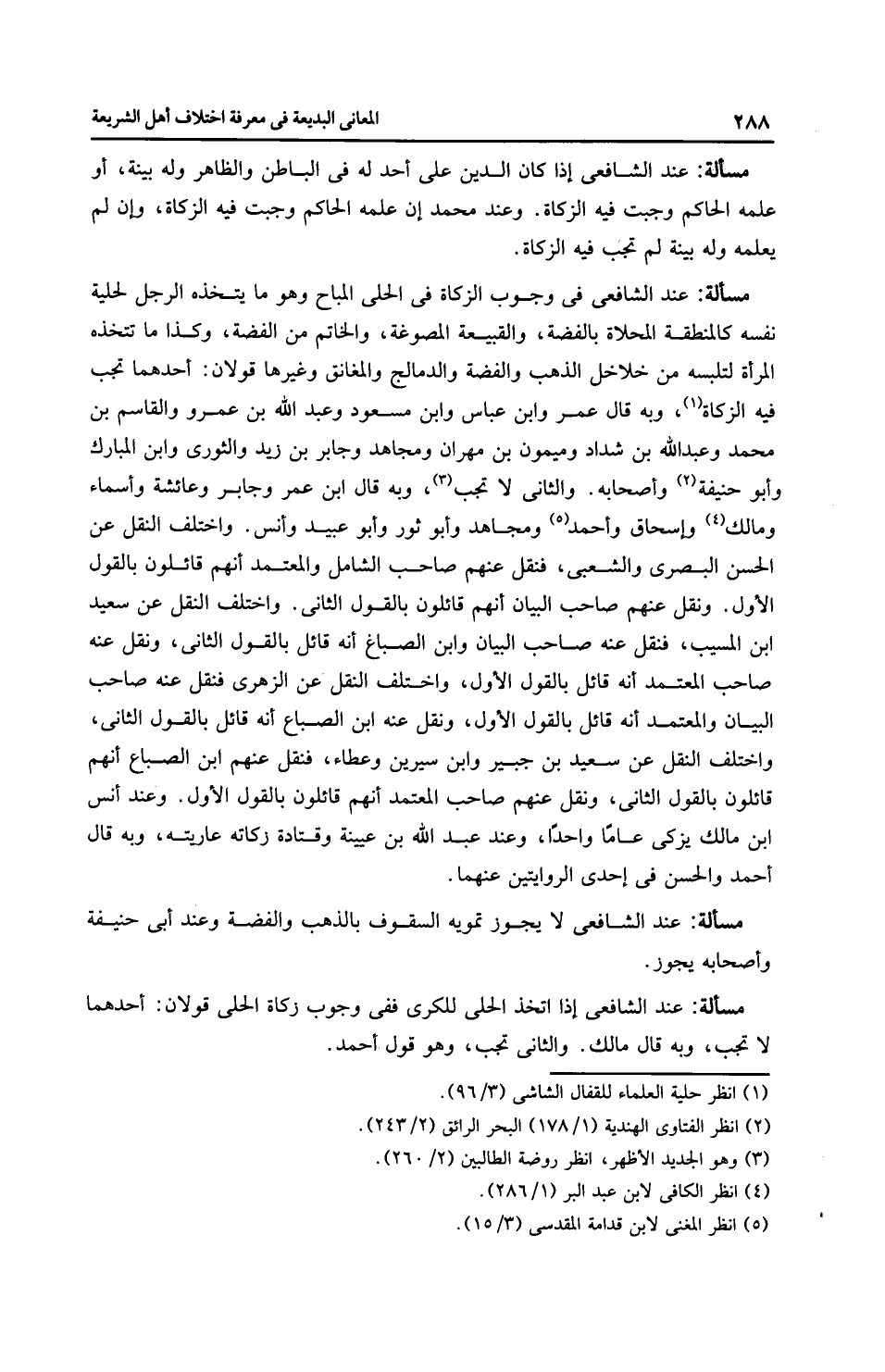 مَسْأَلَةٌ: عِنْدَ الشَّافِعِيِّ في وجوب الزكاة في الحلي المباح وهو ما يتخذه الرجل لحلية نفسه كالمنطقة المحلاة بالفضة، والقبيعة المصوغة، والخاتم من الفضة، وكذا ما تتخذه المرأة لتلبسه من خلاخل الذهب والفضة والدمالج والمغانق وغيرها قَوْلَانِ: أحدهما تجب فيه الزكاة، وبه قال عمر وابن عَبَّاسٍ وابن مسعود وعبد الله بن عمرو والقاسم بن مُحَمَّد وعبد الله بن شداد وميمون بن مهران ومجاهد وجابر بن زيد والثَّوْرِيّ وابن الْمُبَارَك وأبو حَنِيفَةَ وأصحابه. والثاني لا تجب، وبه قال ابن عمر وجابر وعائشة وأسماء وَمَالِك وإِسْحَاق وَأَحْمَد ومجاهد وأبو ثور وأبو عبيد وأنس. واختلف النقل عن الحسن البصري والشعبي، فنقل عنهم صاحب الشامل والمعتمد أنهم قائلون بالقول الأول. ونقل عهم صاحب البيان أنهم قائلون بالقول الثاني. واختلف النقل عن سعيد ابن السيب، فنقل عنه صاحب البيان وابن الصباغ أنه قائل بالقول الثاني، ونقل عنه صاحب المعتمد أنه قائل بالقول الأول، واختلف النقل عن الزُّهْرِيّ فنقل عنه صاحب البيان والمعتمد أنه قائل بالقول الأول، ونقل عنه ابن الصباع أنه قائل بالقول الثاني، واختلف النقل عن سعيد بن جبير وابن سِيرِينَ وعَطَاء، فنقل عنهم ابن الصباع أنهم قائلون بالقول الثاني، ونقل عنهم صاحب المعتمد أنهم قائلون بالقول الأول. وعند أنس ابن مالك يزكى عامًا واحدًا، وعند عبد الله بن عيينة وقتادة زكاته عاريته، وبه قال أَحْمَد والحسن في إحدى الروايتين عنهما.
