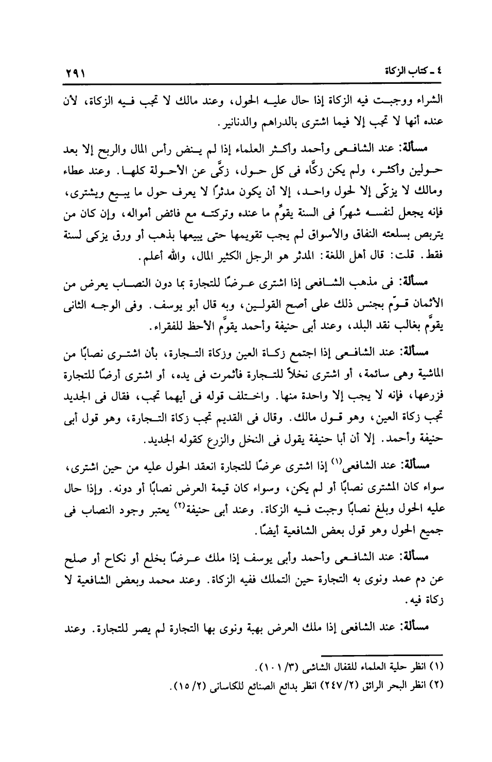 مَسْأَلَةٌ: عِنْدَ الشَّافِعِيِّ إذا اشترى عرضًا للتجارة انعقد الحول عليه من حين اشترى، سواء كان المشتري نصابًا أو لم يكن، وسواء كان قيمة العرض نصابًا أو دونه. وإذا حال عليه الحول وبلغ نصابًا وجبت فيه الزكاة. وعند أَبِي حَنِيفَةَ يعتبر وجود النصاب في جميع الحول وهو قول بعض الشَّافِعِيَّة أيضًا.