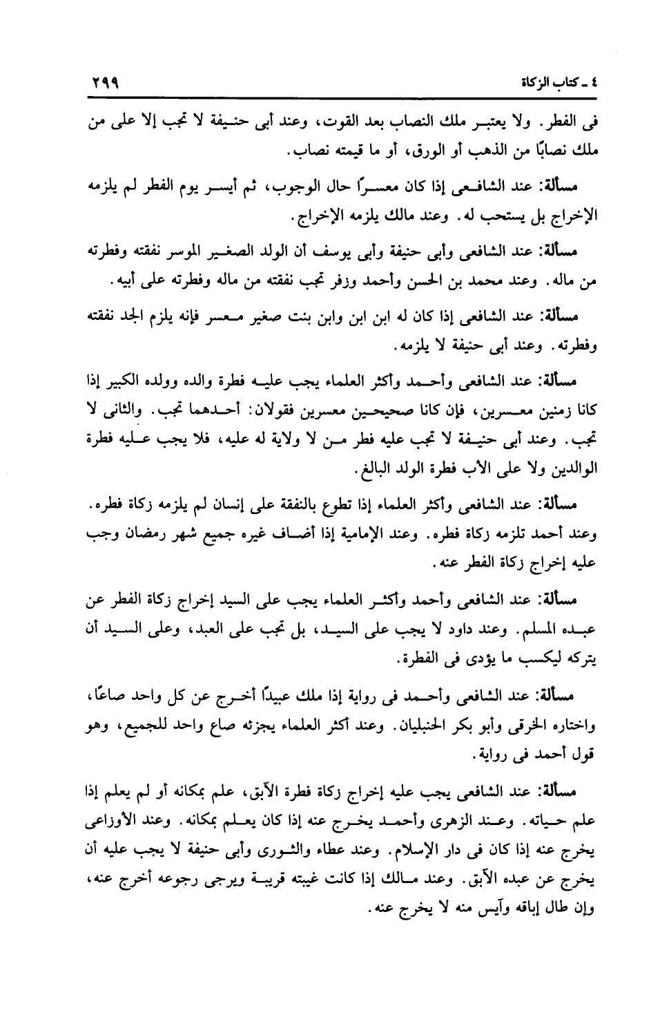 مَسْأَلَةٌ: عِنْدَ الشَّافِعِيِّ وَأَحْمَدَ وأَكْثَر الْعُلَمَاءِ يجب على السيد إخراج زكاة الفطر عن عبده المسلم. وعند داود لا يجب على السيد، بل تجب على العبد، وعلى السيد أن يتركه ليكسب ما يؤدى في الفطرة.