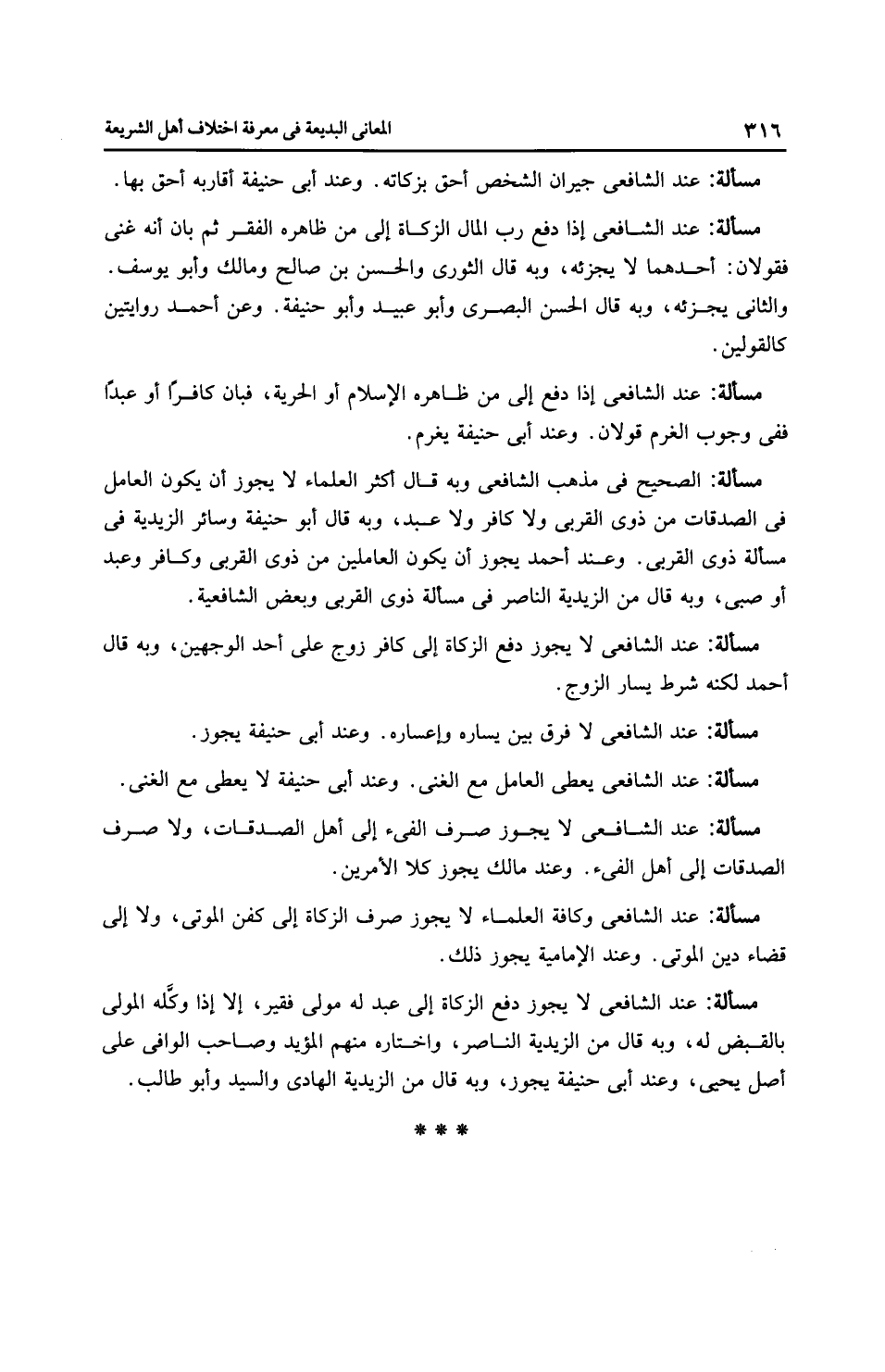 مَسْأَلَةٌ: عِنْدَ الشَّافِعِيِّ جيران الشخص أحق بزكاته. وعند أَبِي حَنِيفَةَ أقاربه أحق بها.