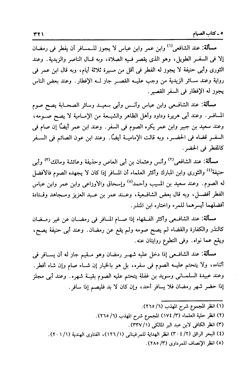 مَسْأَلَةٌ: عِنْدَ الشَّافِعِيِّ وابن عَبَّاسٍ وأنس وأبي سعيد وسائر الصحابة يصح صوم المسافر. وعند أبي هريرة وداود وأهل الظاهر والشيعة من الْإِمَامِيَّة لا يصح صومه، وعند سعيد بن جبير وابن عمر يكره الصوم في السفر. وعند ابن عمر أيضًا إن صام في السفر قضاه في الحضر، وبه قالت الْإِمَامِيَّة أيضًا. وعند ابن عون الصائم في السفر كالمفطر في الحضر.