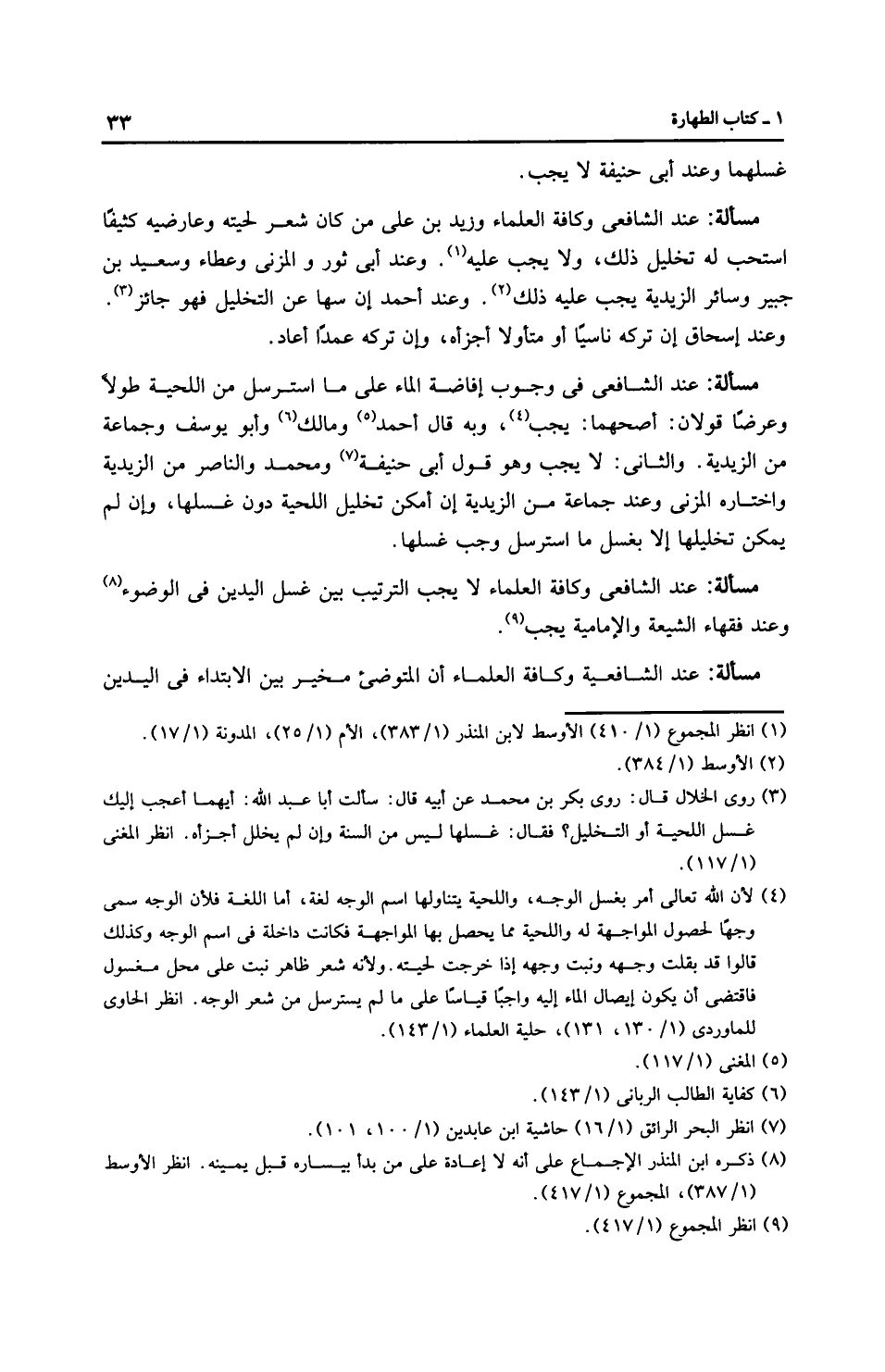 مَسْأَلَةٌ: عِنْدَ الشَّافِعِيِّ في وجوب إفاضة الماء على ما استرسل من اللحية طولاً وعرضًا قَوْلَانِ: أصحهما: يجب، وبه قال أَحْمَد وَمَالِك وأبو يوسف وجماعة من الزَّيْدِيَّة. والثاني: لا يجب وهو قول أَبِي حَنِيفَةَ ومُحَمَّد والنَّاصِر من الزَّيْدِيَّة واختاره الْمُزَنِي وعند جماعة من الزَّيْدِيَّة إن أمكن تخليل اللحية دون غسلها، وإن لم يمكن تخليلها إلا بغسل ما استرسل وجب غسلها.