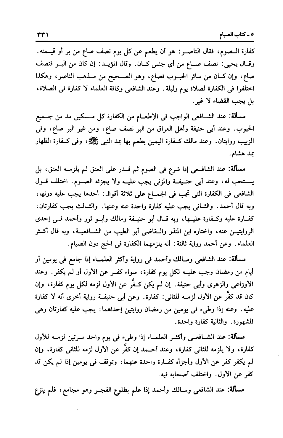مَسْأَلَةٌ: عِنْدَ الشَّافِعِيِّ الواجب في الإطعام من الكفارة كل مسكين مد من جميع الحبوب. وعند أَبِي حَنِيفَةَ وأهل العراق من البر نصف صاع، ومن غير البر صاع، وفي الزبيب رِوَايَتَانِ. وعند مالك كفارة الْيَمِين يطعم بها بمد النبي - صلى الله عليه وسلم -، وفي كفارة الظهار بمد هشام.