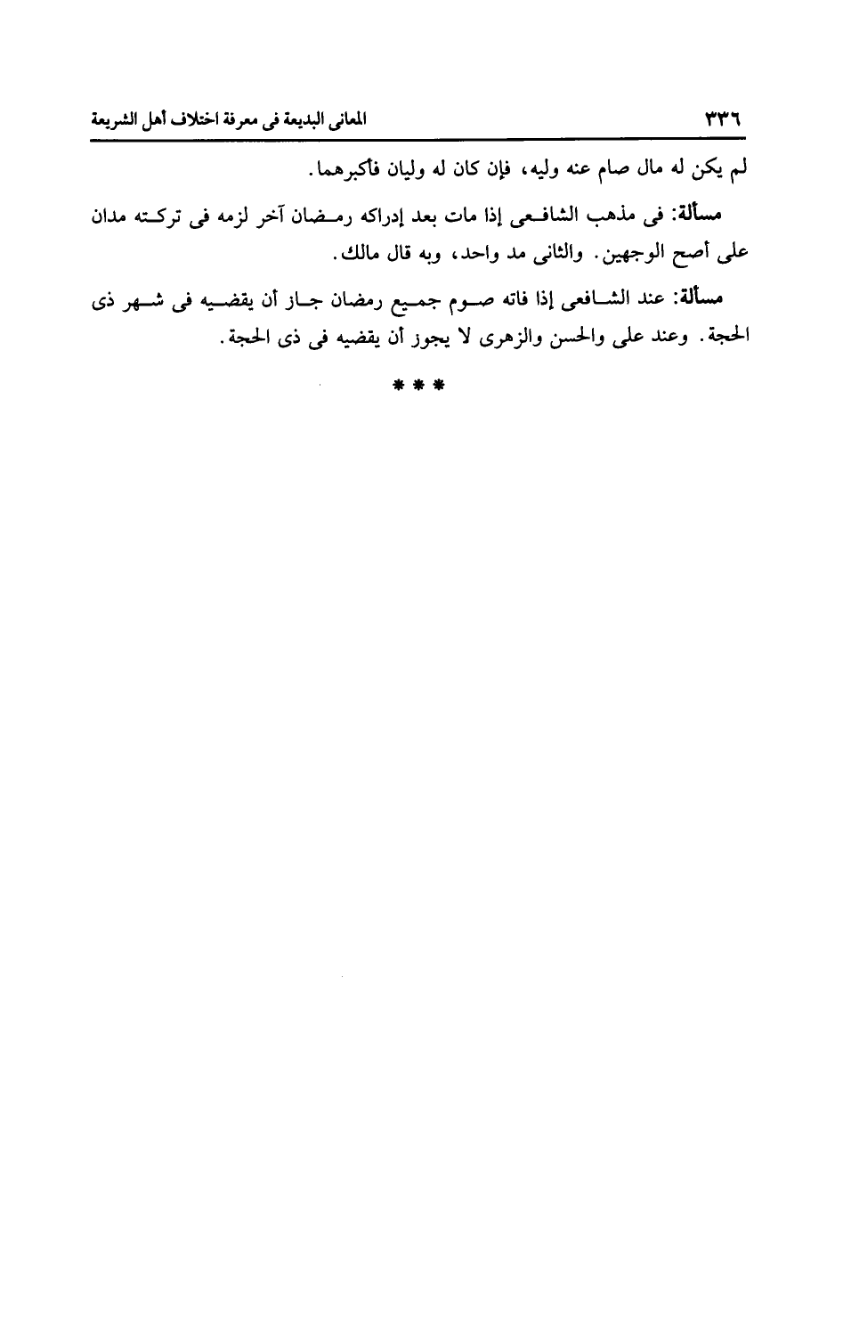 مَسْأَلَةٌ: عِنْدَ الشَّافِعِيِّ إذا فاته صوم جميع رمضان جاز أن يقضيه في شهر ذي الحجة. وعند علي والحسن والزُّهْرِيّ لا يجوز أن يقضيه في ذي الحجة.