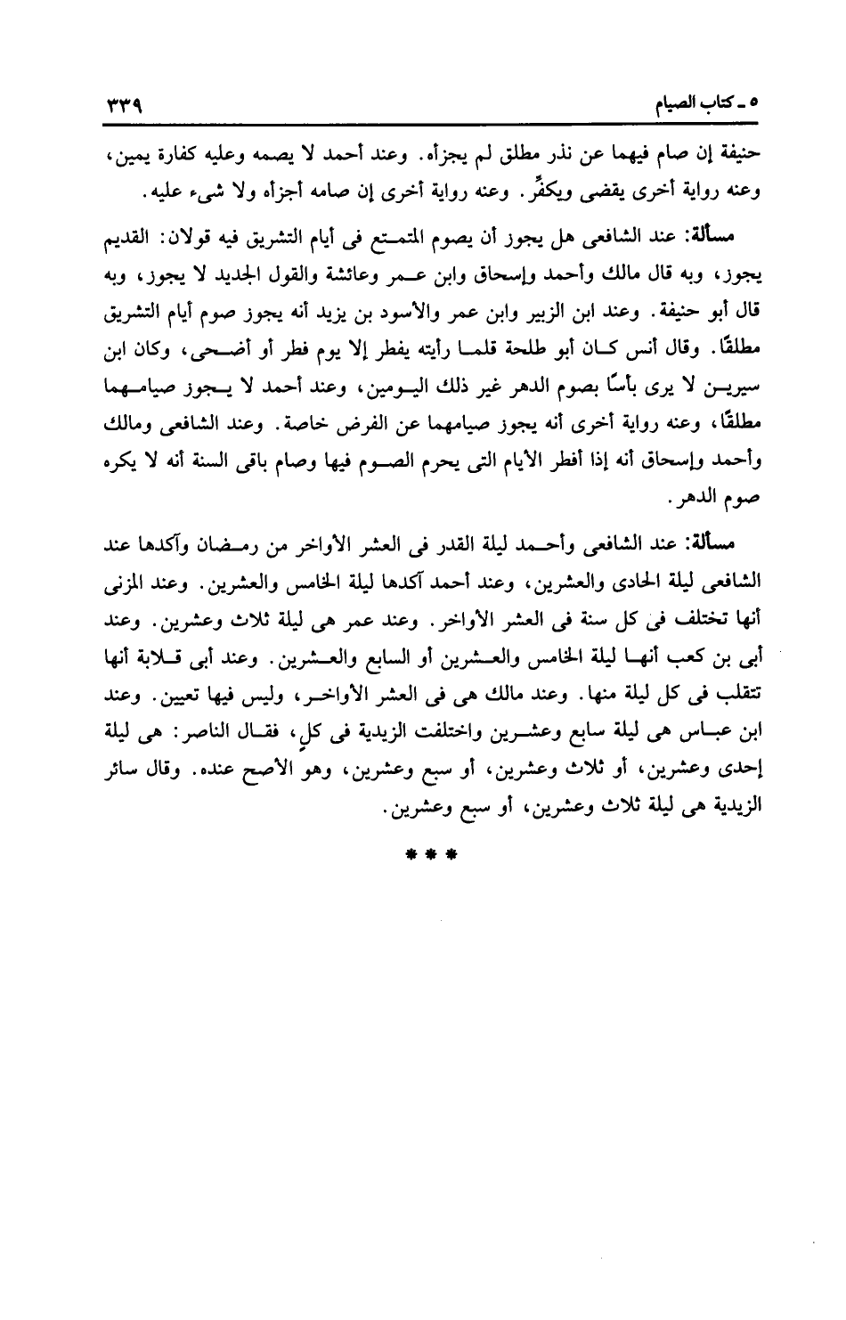 مَسْأَلَةٌ: عِنْدَ الشَّافِعِيِّ هل يجوز أن يصوم المتمتع في أيام التشريق فيه قَوْلَانِ: القديم يجوز، وبه قال مالك وَأَحْمَد وإِسْحَاق وابن عمر وعائشة والقول الجديد لا يجوز، وبه قال أبو حَنِيفَةَ. وعند ابن الزبير وابن عمر والأسود بن يزيد أنه يجوز صوم أيام التشريق مطلقًا. وقال أنس كان أبو طلحة قلما رأيته يفطر إلا يوم فطر أو أضحى، وكان ابن سِيرِينَ لا يرى بأسًا بصوم الدهر غير ذلك اليومين، وعند أَحْمَد لا يجوز صيامهما مطلقًا، وعنه رِوَايَة أخرى أنه يجوز صيامهما عن الفرض خاصة. وعند الشَّافِعِيّ ومالك َوَأَحْمَد وإِسْحَاق أنه إذا أفطر الأيام التي يحرم الصوم فيها وصام باقي السنة أنه لا يكره صوم الدهر.