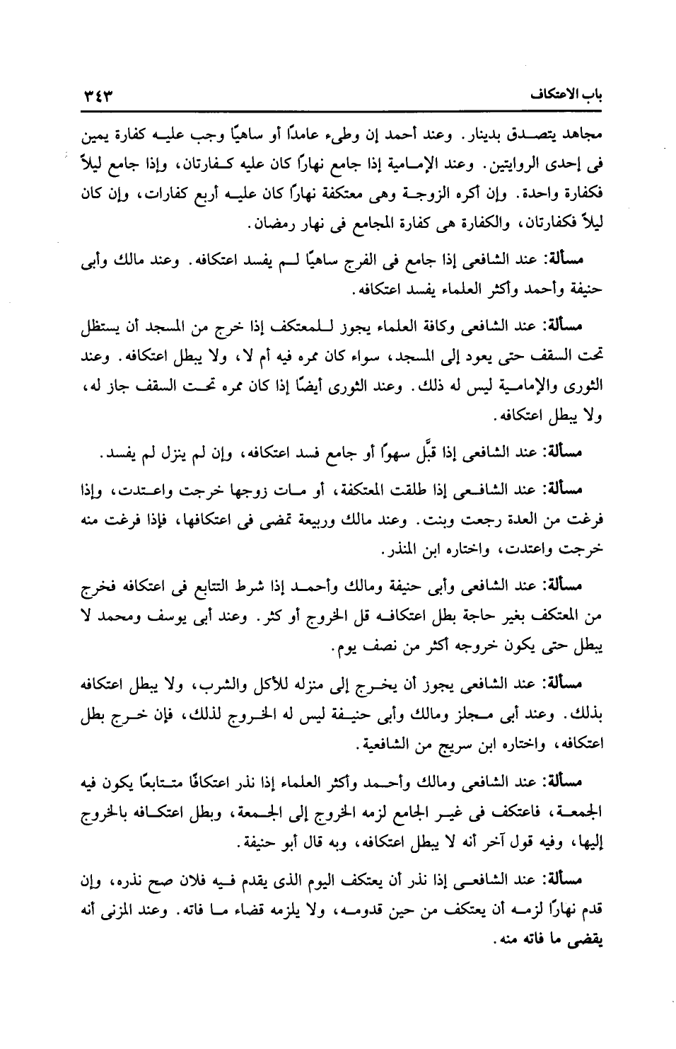مسألة: عند الشَّافِعِيّ وكافة العلماء يجوز للمعتكف إذا خرج من المسجد أن يستظل تحت السقف حتى يعود إلى المسجد، سواء كان ممره فيه أم لا، ولا يبطل اعتكافه. وعند الثَّوْرِيّ والْإِمَامِيَّة ليس له ذلك. وعند الثَّوْرِيّ أيضًا إذا كان أكره تحت السقف جاز له، ولا يبطل اعتكافه.