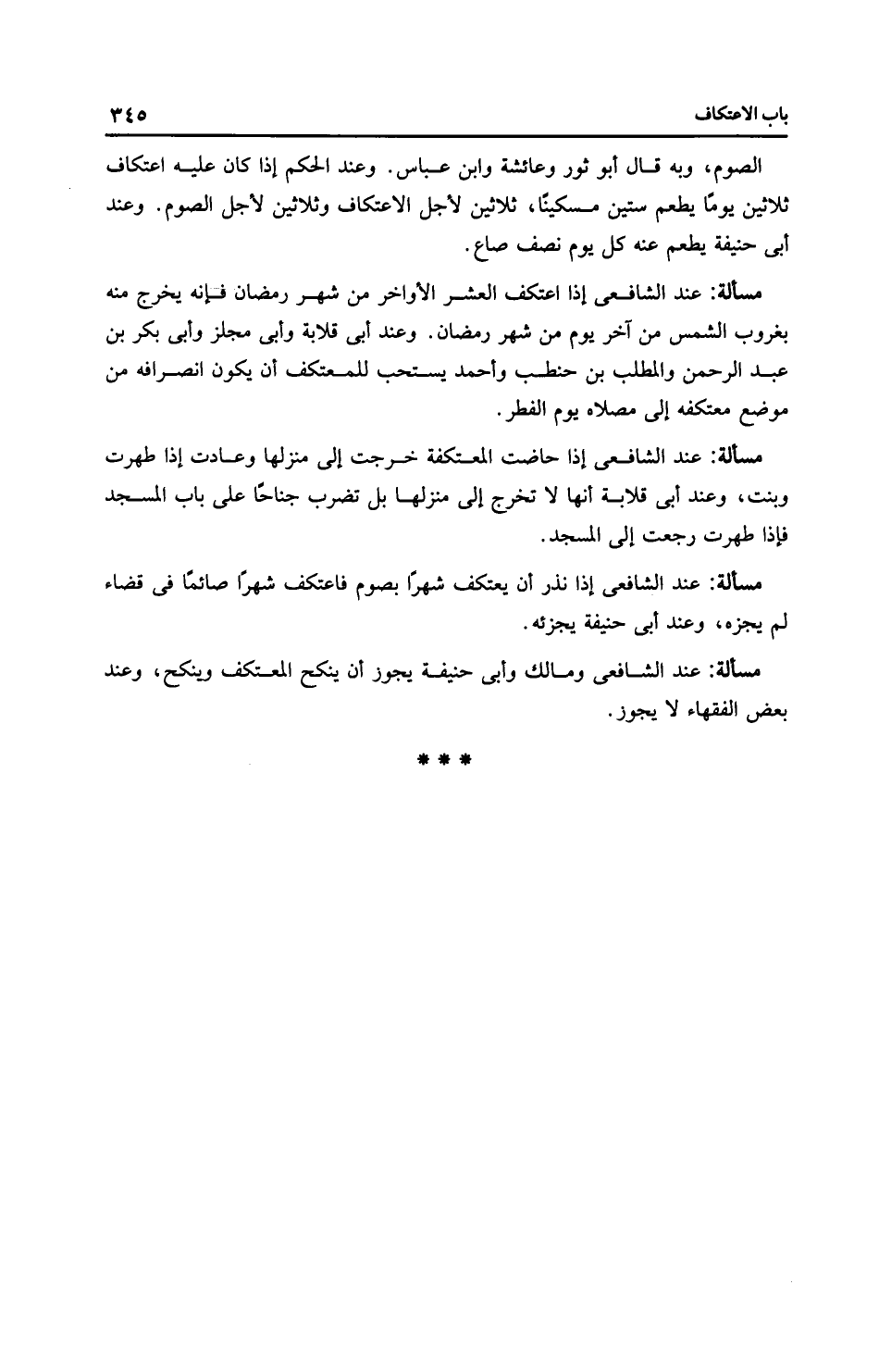 مَسْأَلَةٌ: عِنْدَ الشَّافِعِيِّ إذا اعتكف العشر الأواخر من شهر رمضان فإنه يخرج منه بغروب الشمس من آخر يرم من شهر رمضان. وعند أبي قلابة وأبي مجلز وأبي بكر بن عبد الرحمن والمطلب بن حنطب وَأَحْمَد يستحب للمعتكف أن يكون انصرافه من موضع معتكفه إلى مصلاه يوم الفطر.