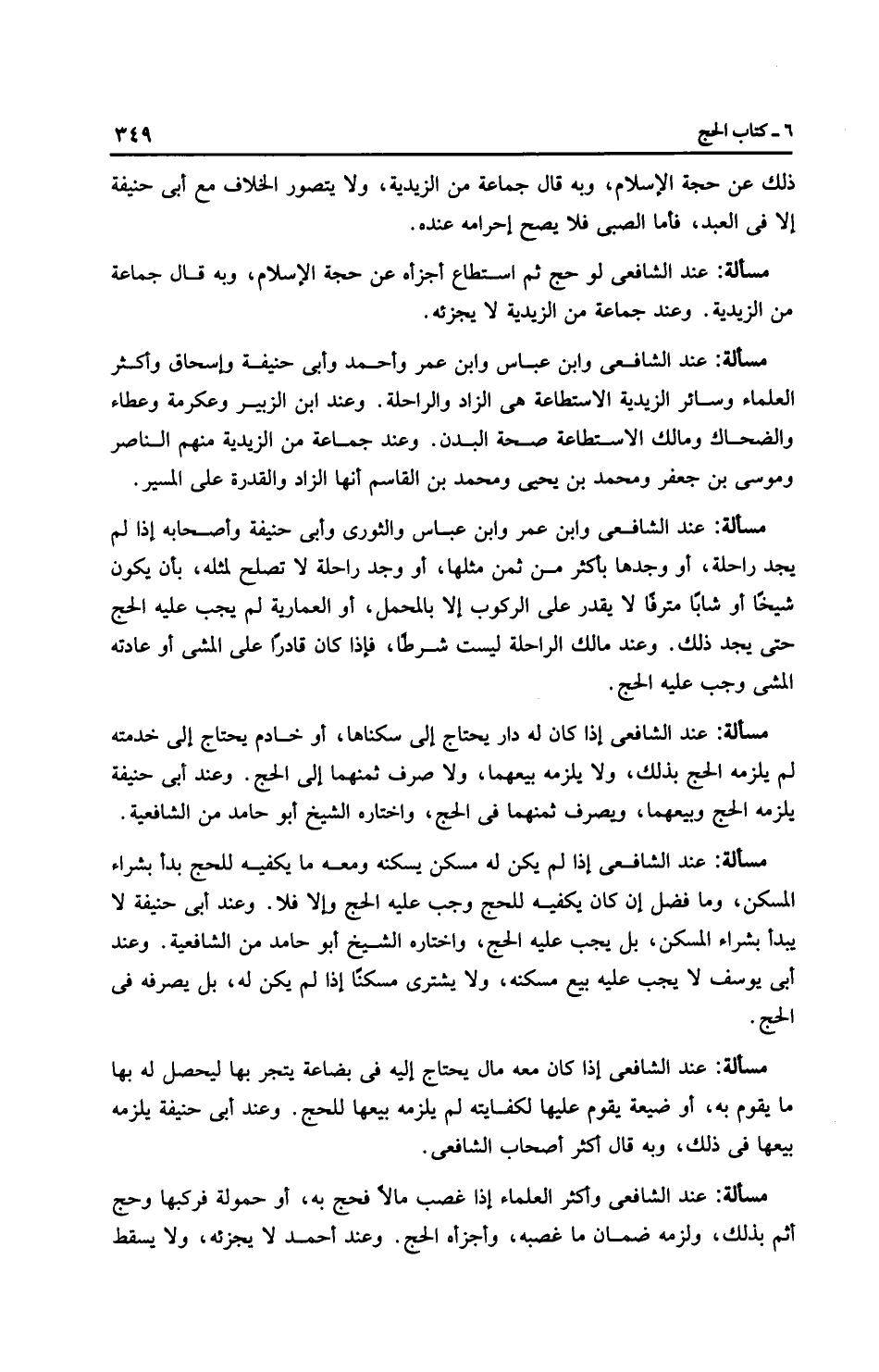 مَسْأَلَةٌ: عِنْدَ الشَّافِعِيِّ إذا لم يكن له مسكن يسكنه ومعه ما يكفيه للحج بدأ بشراء المسكن، وما فضل ان كان يكفيه للحج وجب عليه الحج وإلا فلا. وعند أَبِي حَنِيفَةَ لا يبدأ بشراء المسكن، بل يجب عليه الحج، واختاره الشيخ أبو حامد من الشَّافِعِيَّة. وعند أَبِي يُوسُفَ لا يجب عليه بيع مسكنه، ولا يشترى مسكنًا إذا لم يكن له، بل يصرفه في الحج.