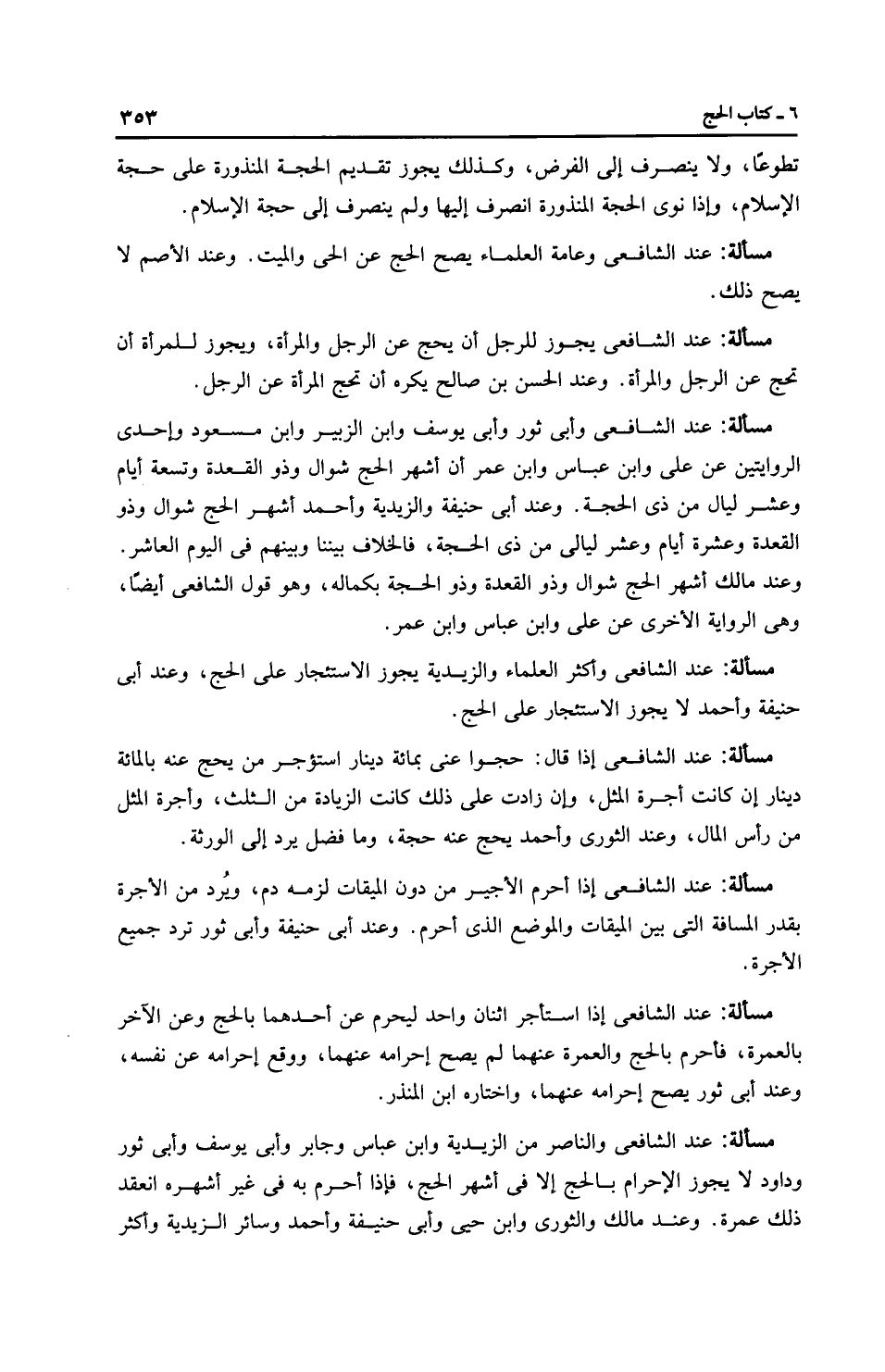 مَسْأَلَةٌ: عِنْدَ الشَّافِعِيِّ يجوز للرجل أن يحج عن الرجل والمرأة، ويجوز للمرأة أن تحج عن الرجل والمرأة. وعند الحسن بن صالح يكره أن تحج المرأة عن الرجل.