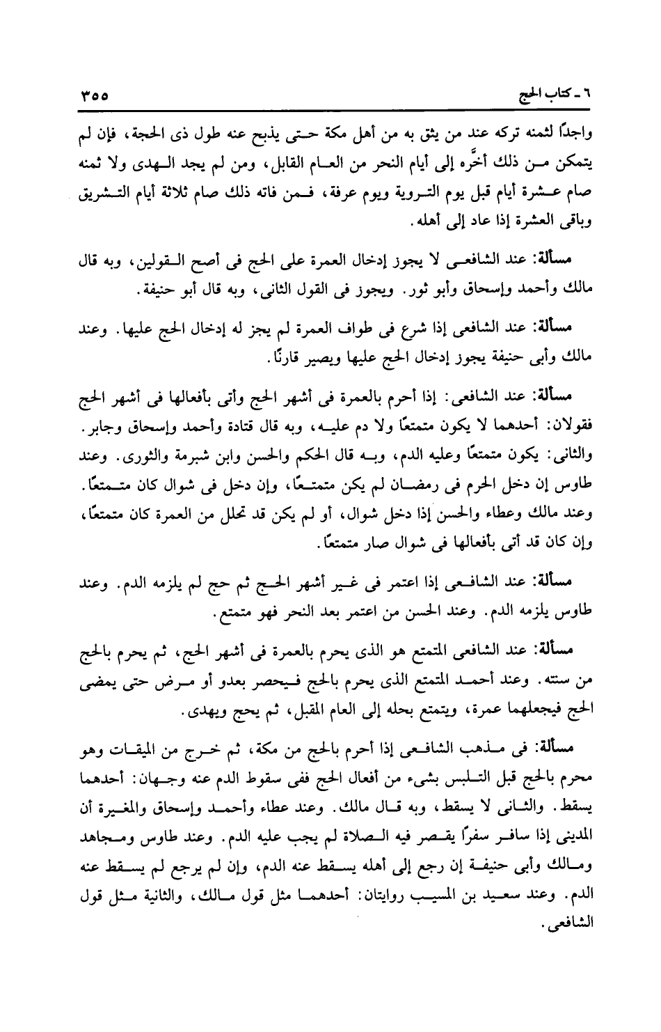 مَسْأَلَةٌ: عِنْدَ الشَّافِعِيِّ المتمتع هو الذي يحرم بالعمرة في أشهر الحج، ثم يحرم بالحج من سنته. وعند أَحْمَد المتمتع الذي يحرم بالحج فيحصر بعدو أو مرض حتى يمضي الحج فيجعلهما عمرة، ويتمتع بحله إلى العام المقبل، ثم يحج ويهدي.