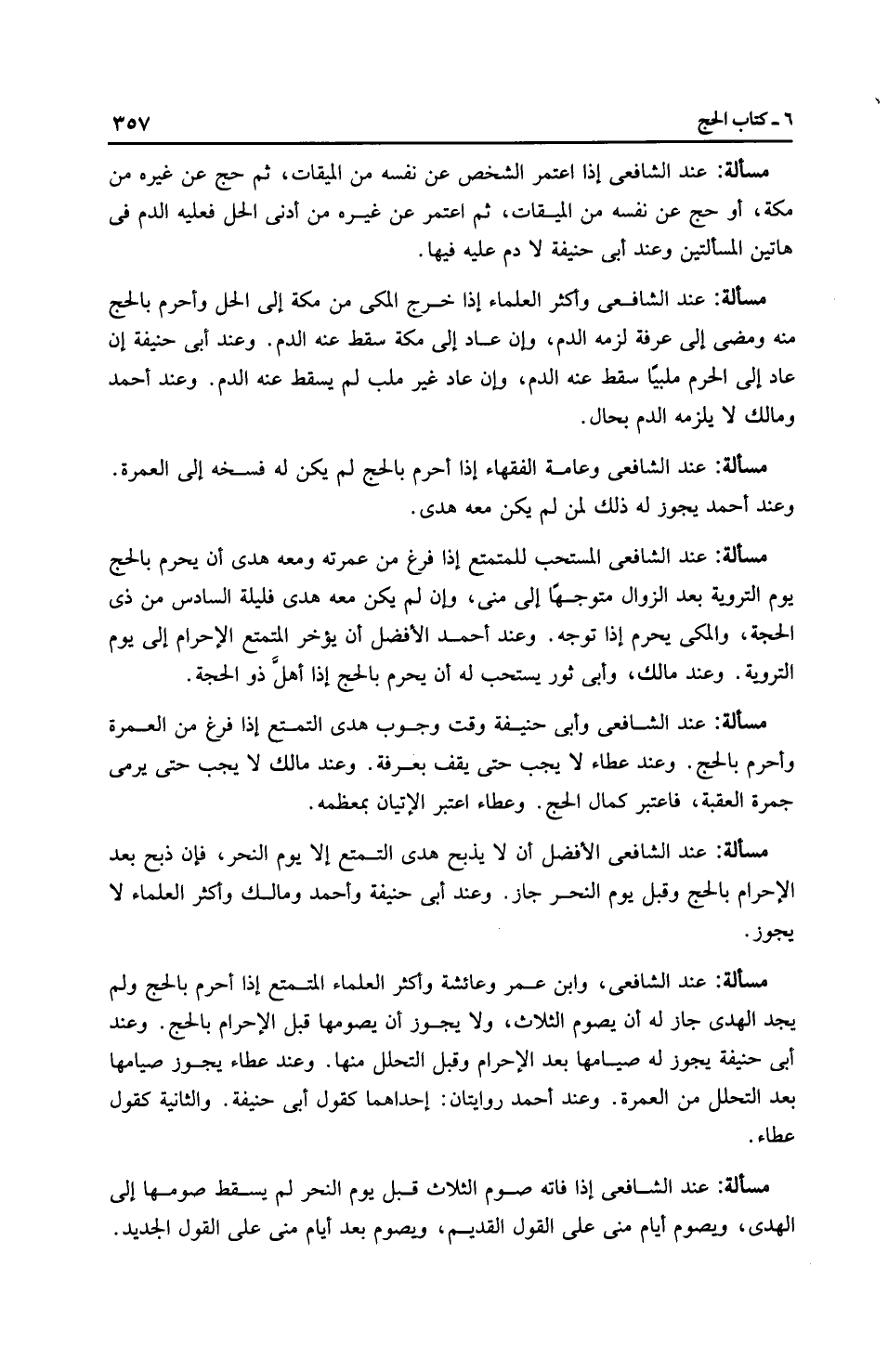 مَسْأَلَةٌ: عِنْدَ الشَّافِعِيِّ المستحب للمتمتع إذا فرغ من عمرته ومعه هدْي أن يحرم بالحج يوم التروية بعد الزوال متوجهًا إلى منى، وإن لم يكن معه هدْي فليلة السادس من ذي الحجة، والمكي يحرم إذا توجه. وعند أَحْمَد الأفضل أن يؤخر المتمتع الإحرام إلى يوم التروية. وعند مالك، وأَبِي ثَورٍ يستحب له أن يحرم بالحج إذا أهلَّ ذو الحجة.