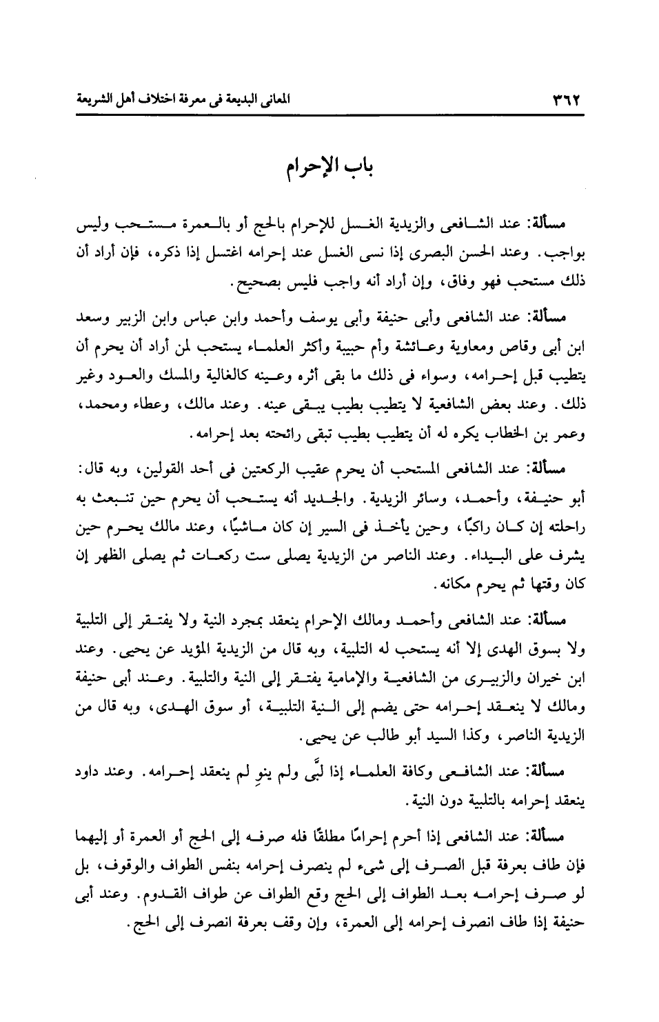 مَسْأَلَةٌ: عِنْدَ الشَّافِعِيِّ وَأَحْمَدَ وَمَالِك الإحرام ينعقد بمجرد النية ولا يفتقر إلى التلبية ولا بسوق الهدْي إلا أنه يستحب له التلبية، وبه قال من الزَّيْدِيَّة المؤيد عن يَحْيَى. وعند ابن خيران والزبيري من الشَّافِعِيَّة والْإِمَامِيَّة يفتقر إلى النية والتلبية. وعند أَبِي حَنِيفَةَ وَمَالِك لا ينعقد إحرامه حتى يضم إلى النية التلبية، أو سوق الهدْي، وبه قال من الزَّيْدِيَّة النَّاصِر، وكذا السيد أبو طالب عن يَحْيَى.