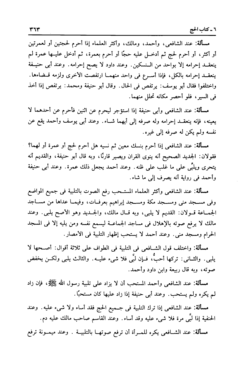 مَسْأَلَةٌ: عِنْدَ الشَّافِعِيِّ، وَأَحْمَد، ومالك، وأَكْثَر الْعُلَمَاءِ إذا أحرم لحجتين أو لعمرتين أو أكثر، أو أحرم لحج ثم أدخل عليه حجًا أو أحرم بعمرة، ثم أدخل عليها عمرة لم ينعقد إحرامه إلا بواحد من النسكين. وعند داود لا يصح إحرامه. وعند أَبِي حَنِيفَةَ ينعقد إحرامه بالكل، فإذا أسرع في واحد منهما ارتفصت الأخرى ولزمه قضاءها. واختلفوا فقال أبو يوسف: يرتفص في الحال. وقال أبو حَنِيفَةَ ومحمد: يرتفص إذا أخذ فى السير، فلو أحصر مكانه تحلل منهما.