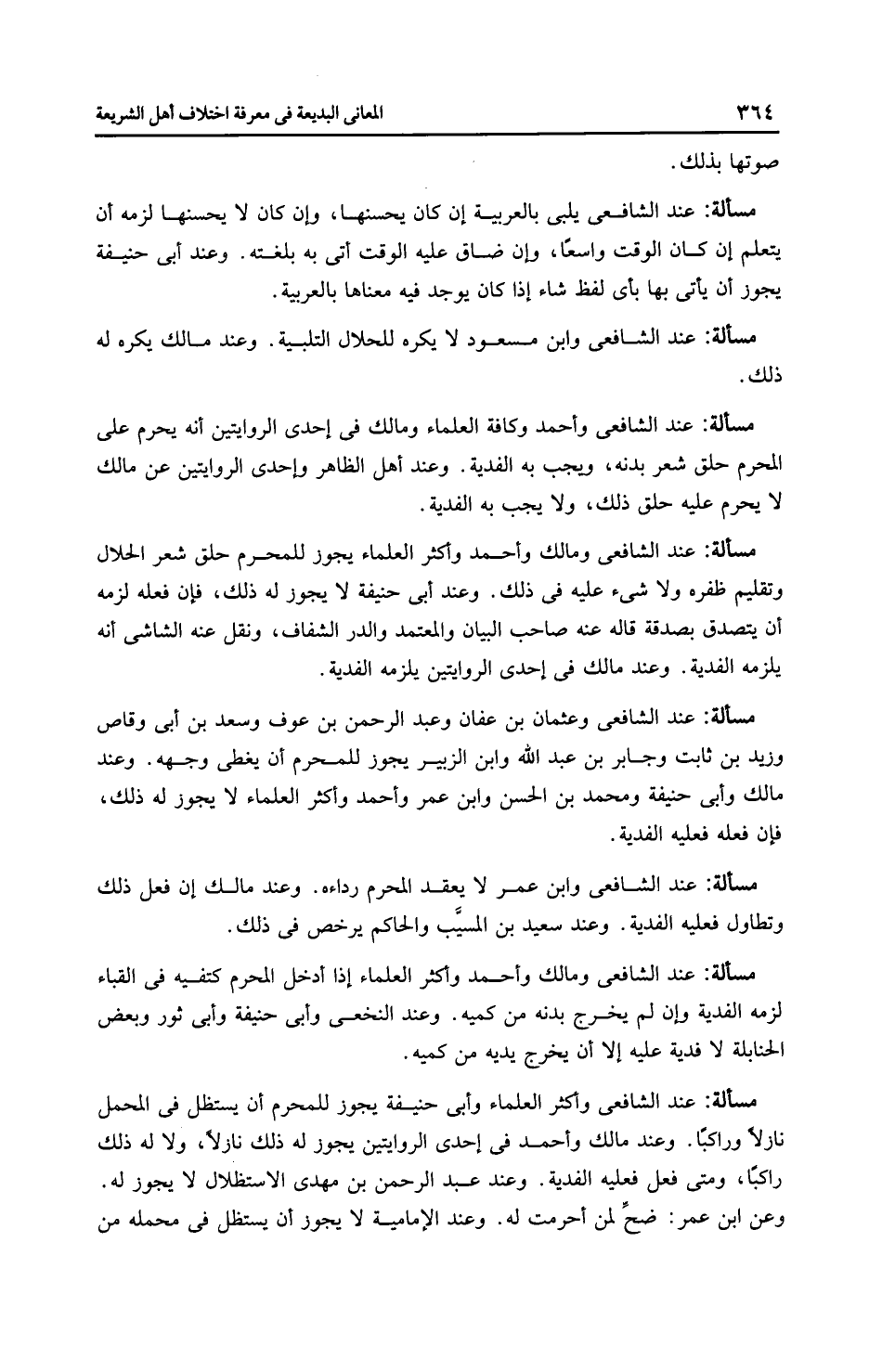 مَسْأَلَةٌ: عِنْدَ الشَّافِعِيِّ وابن عمر لا يعقد المحرم رداءه. وعند مالك إن فعل ذلك وتطاول فعليه الفدية. وعند سعيد بن المسيب والحاكم يرخص في ذلك.
