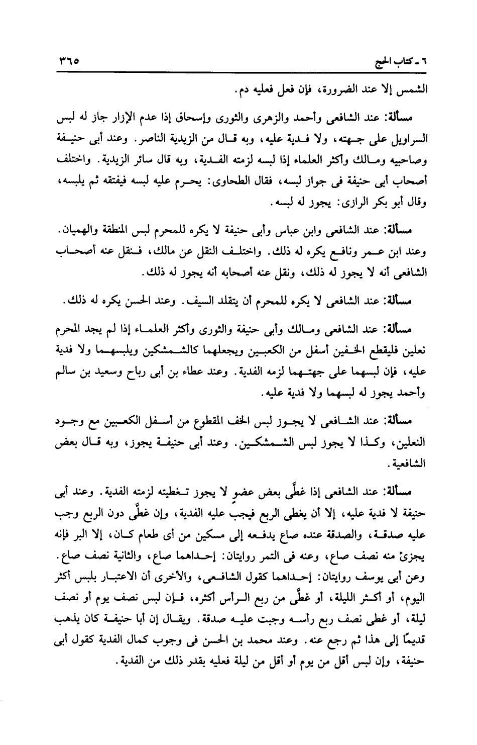 مَسْأَلَةٌ: عِنْدَ الشَّافِعِيِّ إذا غطَّى بعض عضوٍ لا يجوز تغطيته لزمته الفدية. وعند أبي حَنِيفَةَ لا فدية عليه، إلا أن يغطى الربع فيجب عليه الفدية، وإن غطَّى دون الربع وجب عليه صدقة، والصدقة عنده صاع يدفعه إلى مسكين من أي طعام كان، إلا البر فإنه يجزئ منه نصف صاع، وعنه في التمر رِوَايَتَانِ: إحداهما صاع، والثانية نصف صاع. وعن أَبِي يُوسُفَ رِوَايَتَانِ: إحداهما كقول الشَّافِعِيّ، والأخرى أن الاعتبار بلبس أكثر اليوم، أو أكثر الليلة، أو غطى من ربع الرأس أكثره، فإن لبس نصف يوم أو نصف ليلة، أو غطى نصف ربع رأسه وجبت عليه صدقة. ويقال إن أبا حَنِيفَةَ كان يذهب قديمًا إلى هذا ثم رجع عنه. وعند مُحَمَّد بن الحسن في وجوب كمال الفدية كقول أبي حَنِيفَةَ، وإن لبس أقل من يوم أو أقل من ليلة فعليه بقدر ذلك من الفدية.