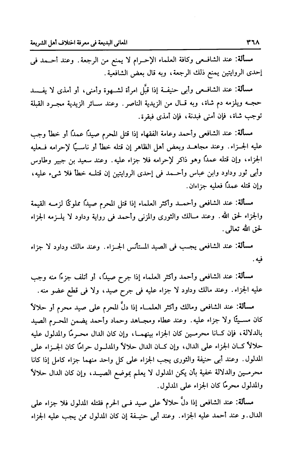 مَسْأَلَةٌ: عِنْدَ الشَّافِعِيِّ إذا دلَّ حلالاً على صيد في الحرم فقتله المدلول فلا جزاء على الدال. وعند أَحْمَد عليه الجزاء. وعند أَبِي حَنِيفَةَ إن كان المدلول ممن يجب عليه الجزاء