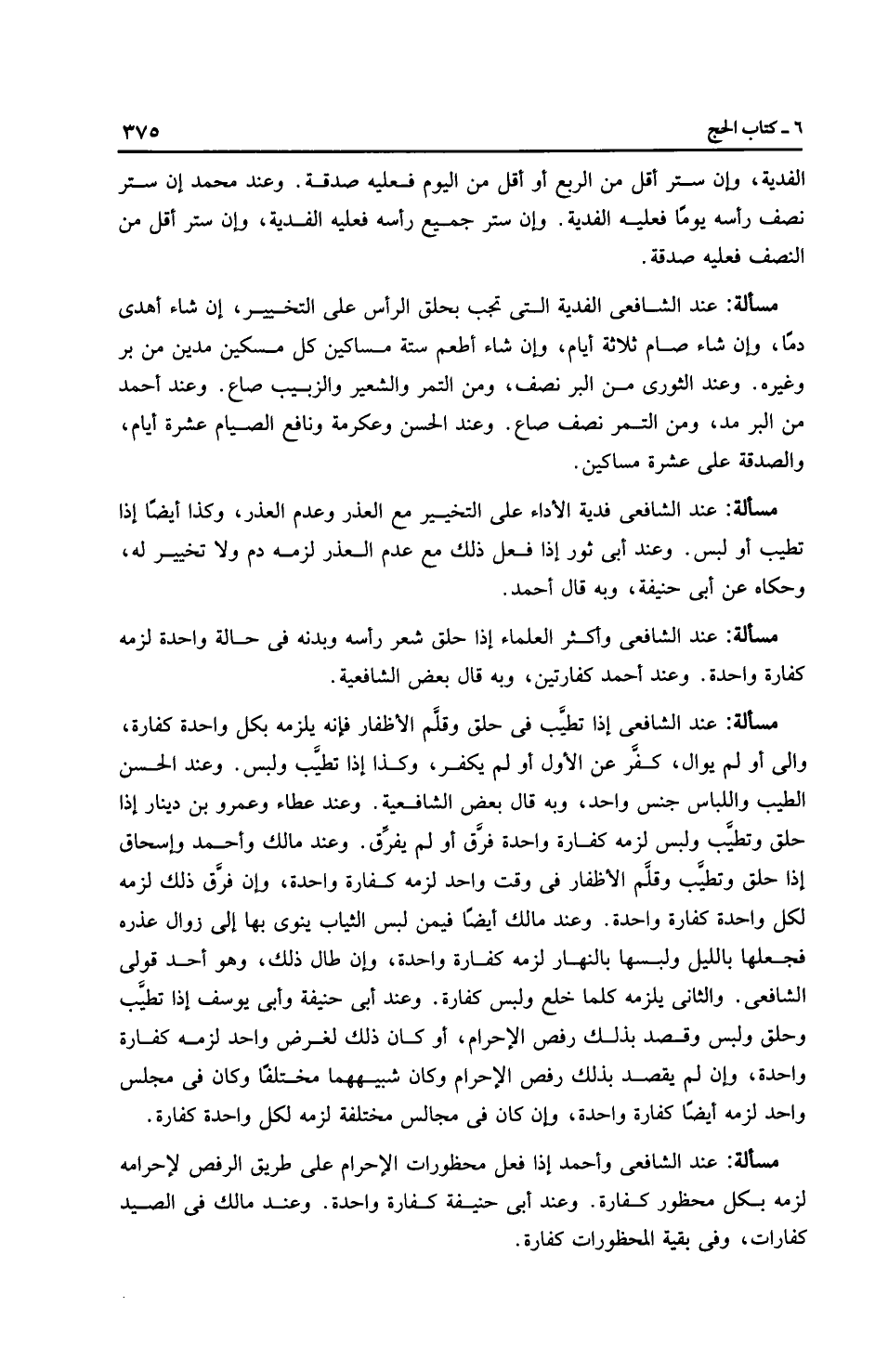 مَسْأَلَةٌ: عِنْدَ الشَّافِعِيِّ الفدية التي تجب بحلق الرأس على التخيير، إن شاء أهدى دمًا، وإن شاء صام ثلاثة أيام، وإن شاء أطعم ستة مساكين كل مسكين مدين من بُر وغيره. وعند الثَّوْرِيّ من البر نصف، ومن التمر والشعير والزبيب صاع. وعند أحمد من البر مد، ومن التمر نصف صاع. وعند الحسن وعكرمة ونافع الصيام عشرة أيام، والصدقة على عشرة مساكين.