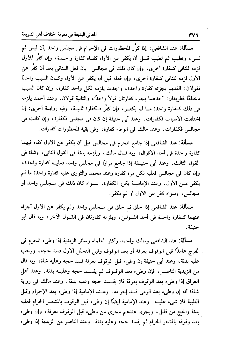 مَسْأَلَةٌ: عِنْدَ الشَّافِعِيِّ: إذا كرَّر المحظورات في الإحرام في مجلس واحد بأن لبس ثم لبس، وتطيب ثم تطيب قبل أن يكفر عن الأول كفاه كفارة واحدة، وإن كفَّر للأول لزمه للثاني كفارة أخرى، وإن كان ذلك في مجالس. بأن فعل الثاني بعد أن كفَّر عن الأول لزمه للثاني كفارة أخرى، وإن فعله قبل أن يكفر عن الأول وكان السبب واحدًا فقَوْلَانِ: القديم يجزئه كفارة واحدة، والجديد يلزمه لكل واحد كفارة، وإن كان السبب مختلفًا فطريقان: أحدهما يجب كفارتان قولا واحدًا، والثانية قَوْلَانِ. وعند أَحْمَد يلزمه فى ذلك كفارة واحدة ما لم يكفر، فإن كفر فكفارة ثانية، وفيه رِوَايَة أخرى: إن اختلفت الأسباب فكفارات. وعند أَبِي حَنِيفَةَ إن كان في مجلس فكفارة، وإن كانت في مجالس فكفارات. وعند مالك في الوطء كفارة، وفي بقية المحظورات كفارات.